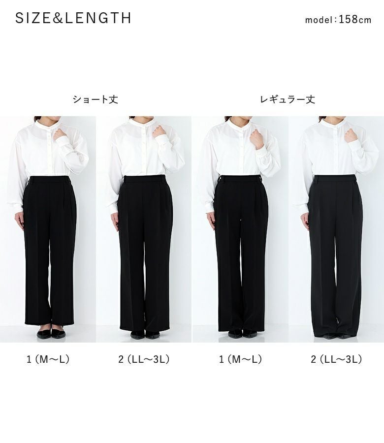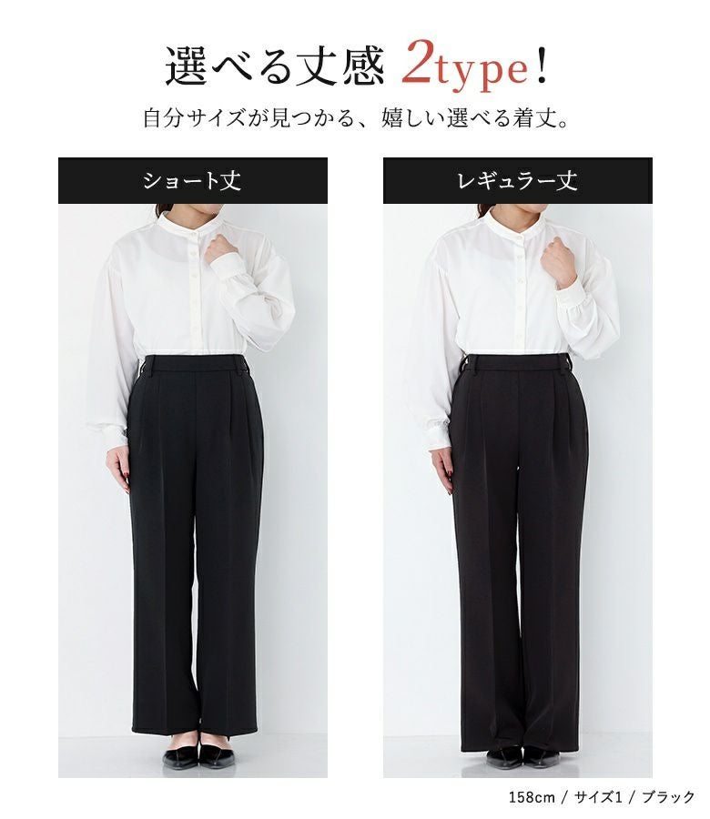 1(ショート丈):丈もウエストもジャストサイズで穿けました。ウエストがゴムなので楽な穿き心地です。 1(レギュラー丈):ヒールを履いてちょうどぐらいの丈です。