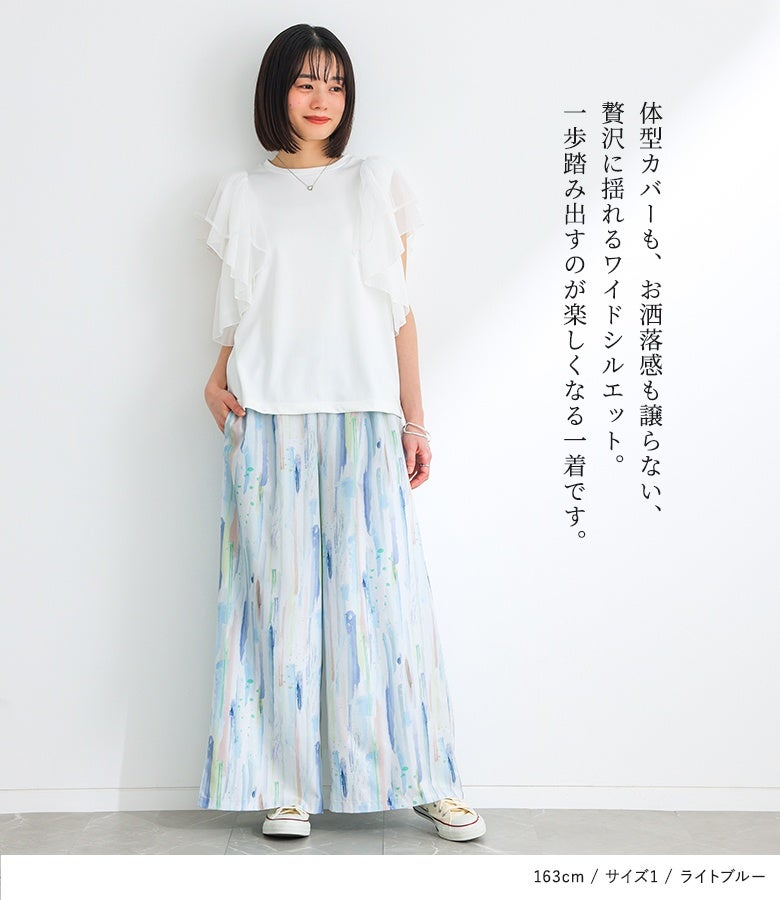 【普段着用】 Tops: L Bottoms: L | 【1】 着丈(ウエスト穿き):かかと上3cm位 ウエスト:ややゆったり ヒップ:ややゆったり 太もも周り:ややゆったり 全体:ややゆったり