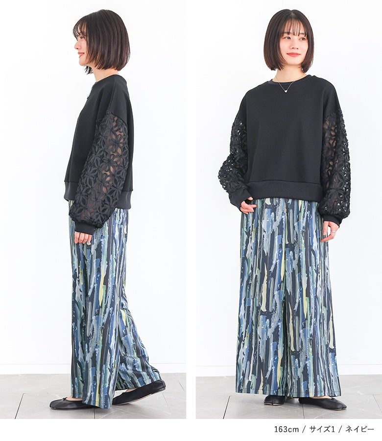 【普段着用】 Tops: M Bottoms:M/L | 【1】 着丈(ウエスト穿き):かかと上3cm位 ウエスト:ゆったり ヒップ:ゆったり 太もも周り:ゆったり 全体:ゆったり
