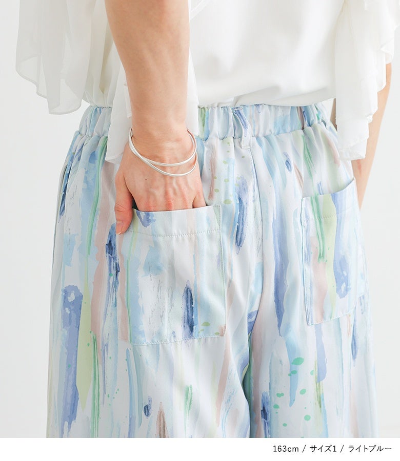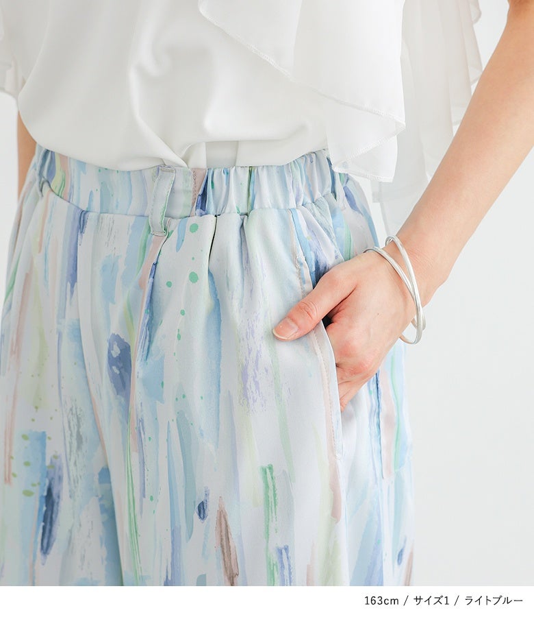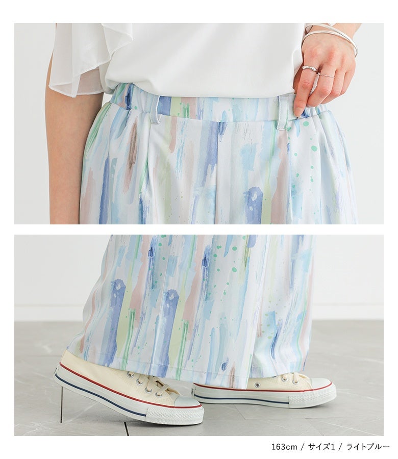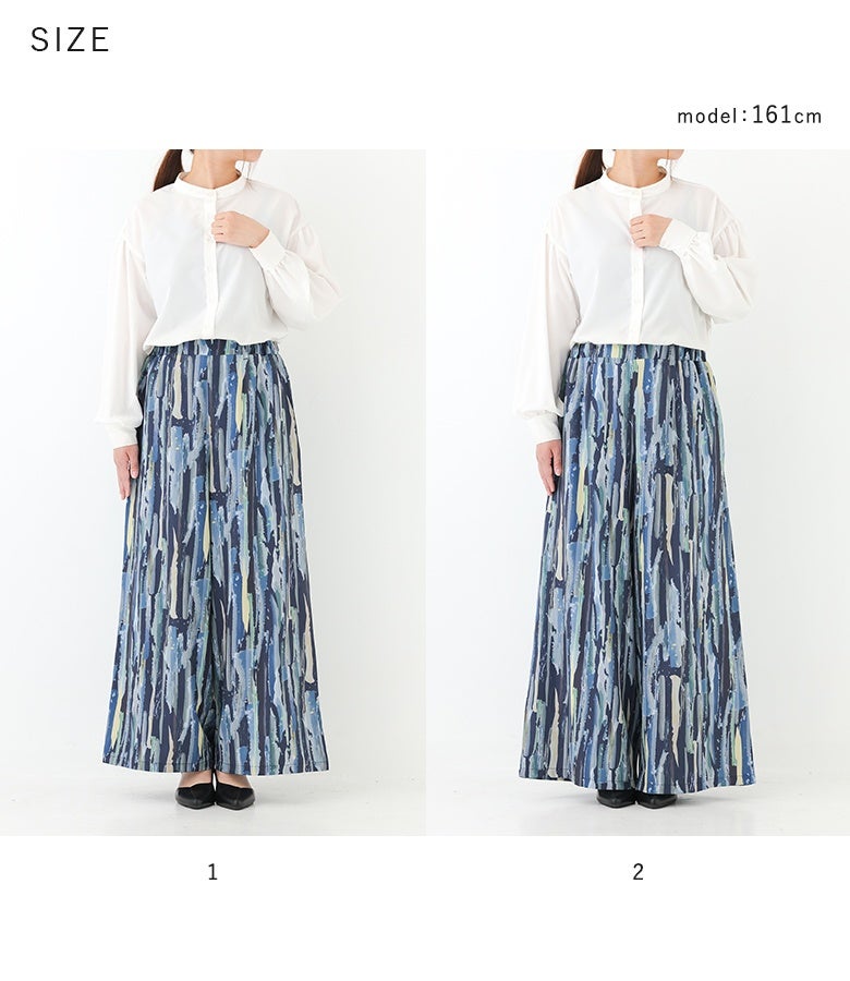 【1】 着丈(ウエスト穿き):くるぶしが隠れる位 ウエスト:ややゆったり ヒップ:ややゆったり 太もも周り:ややゆったり 全体:ややゆったり