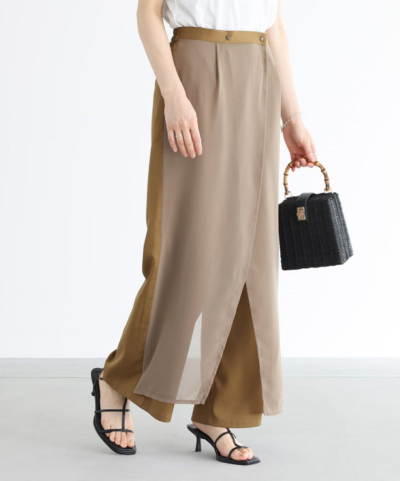 配色のシアー生地をフロントに重ねてドッキングしたワイドパンツ。軽やかに揺れるシフォンが涼し気で個性的な印象に仕立てます。