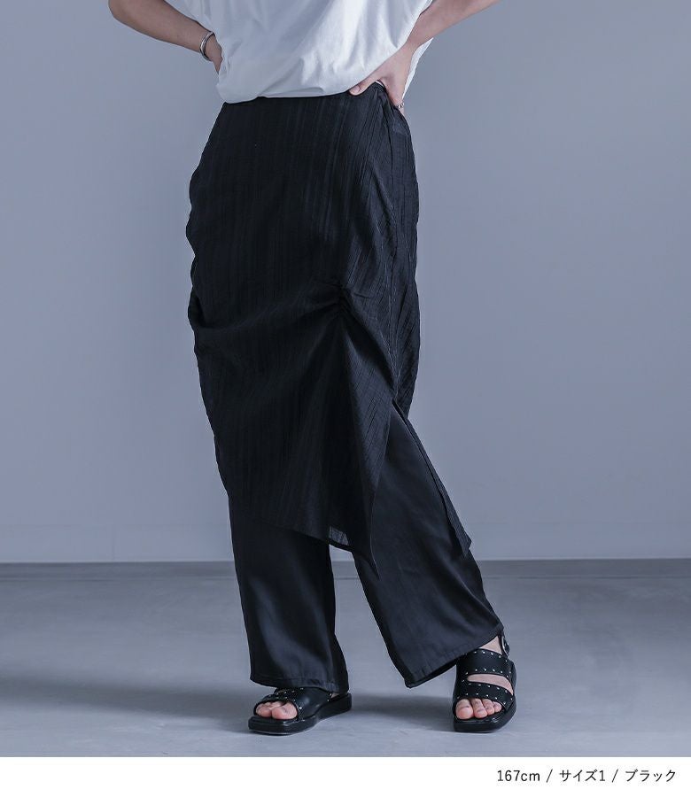 【普段着用】 Tops: M Bottoms: M | 【1】 着丈(ウエスト穿き):ひざ下3cm位 ウエスト:ジャスト ヒップ:ジャスト 太もも周り:ややゆったり 全体:ややゆったり