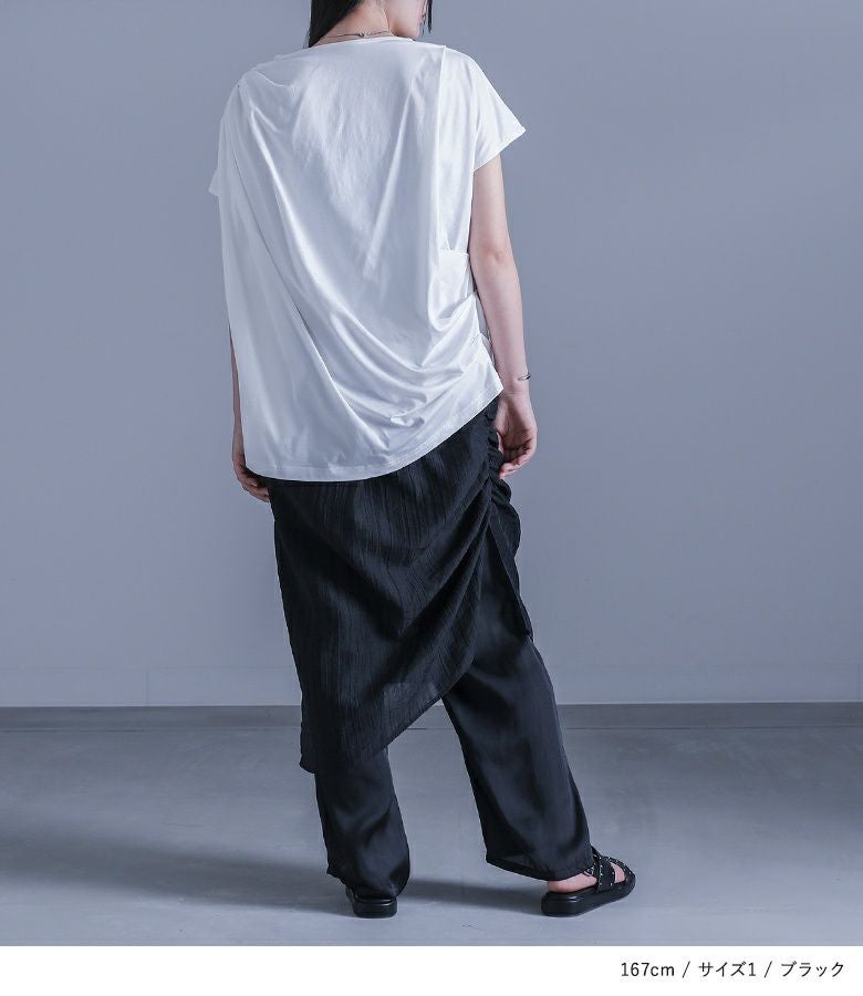 【普段着用】 Tops: S/M Bottoms: S/M | 【1】 着丈(ウエスト穿き):かかとから3cm余る位 ウエスト:ジャスト ヒップ:ややゆったり 太もも周り:ゆったり 全体:ややゆったり
