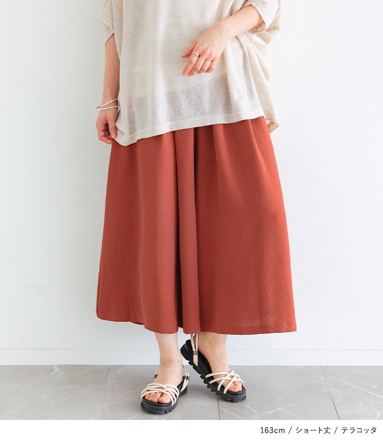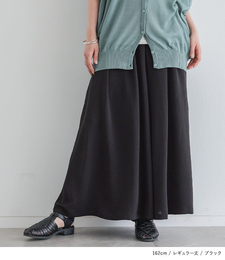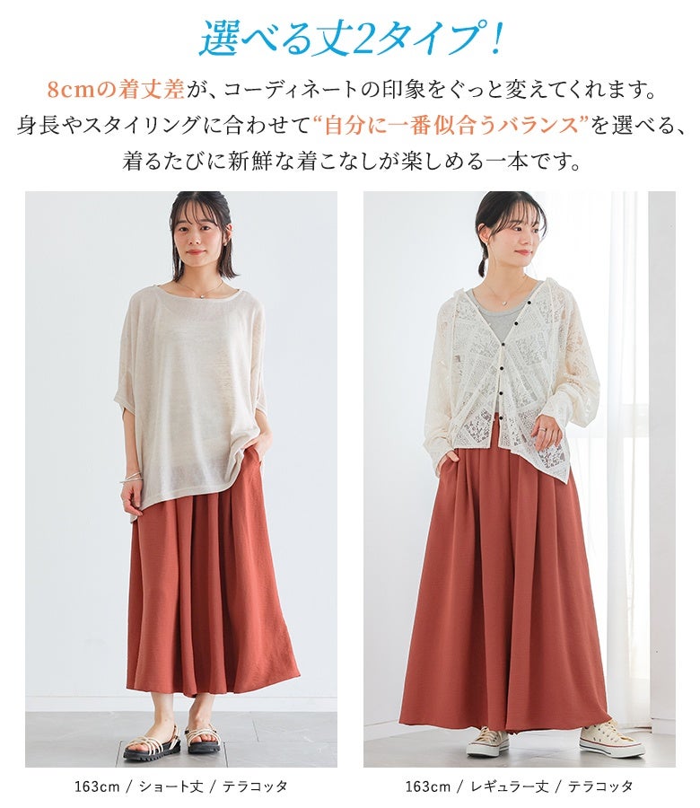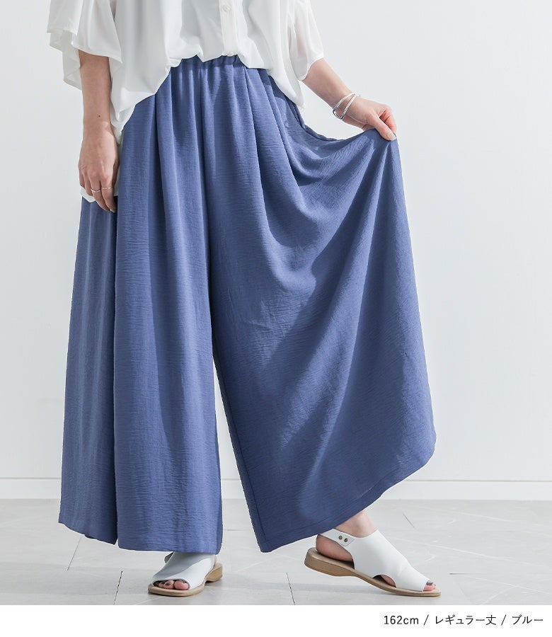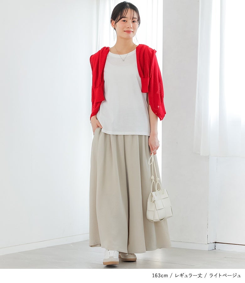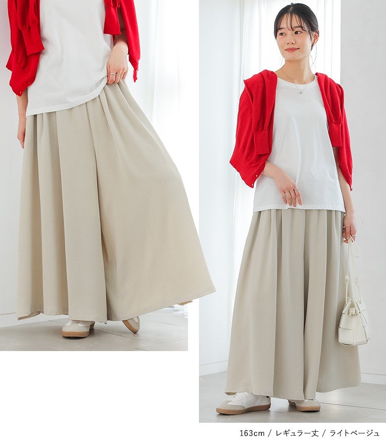 全体的にゆったりしたサイズ感で、ヒップの引っかかりもなし。ウエストも窮屈感ゼロで紐でしっかり留められるので、ずり落ちる心配もありません。シワになりにくく、旅行や長時間の移動にもぴったりです。レギュラー丈は大人っぽく着こなせます。