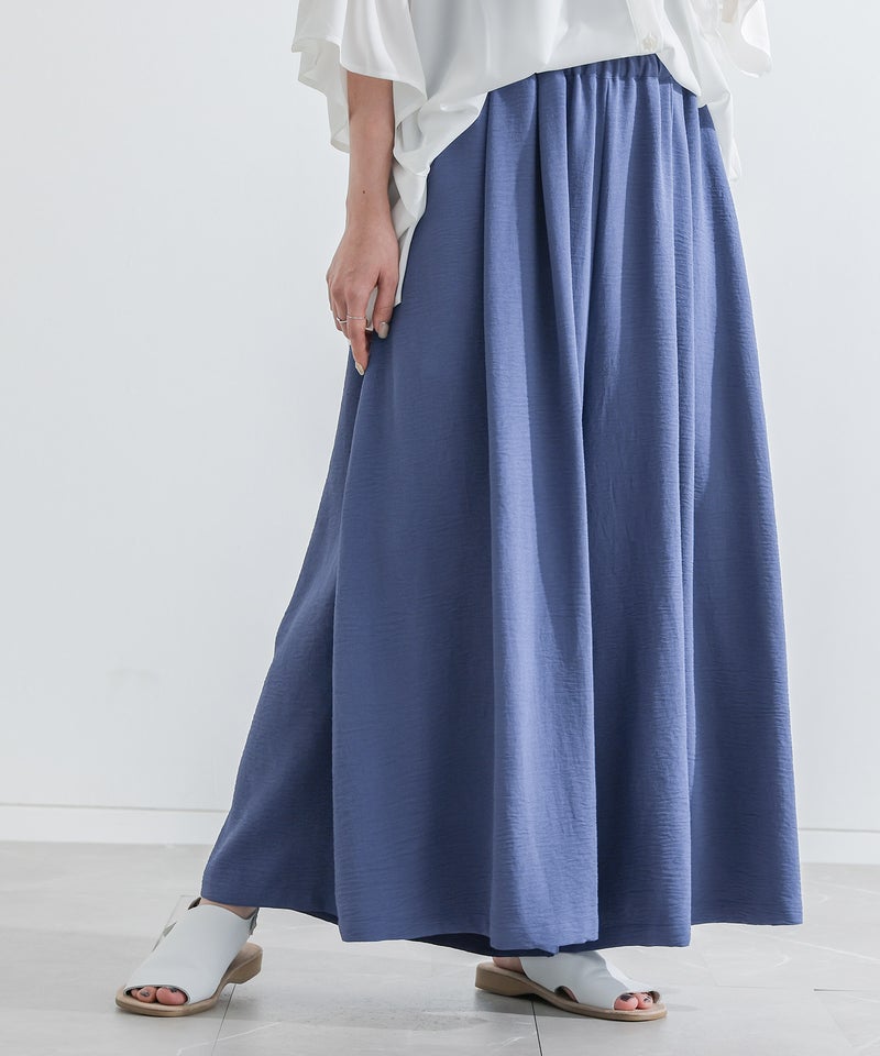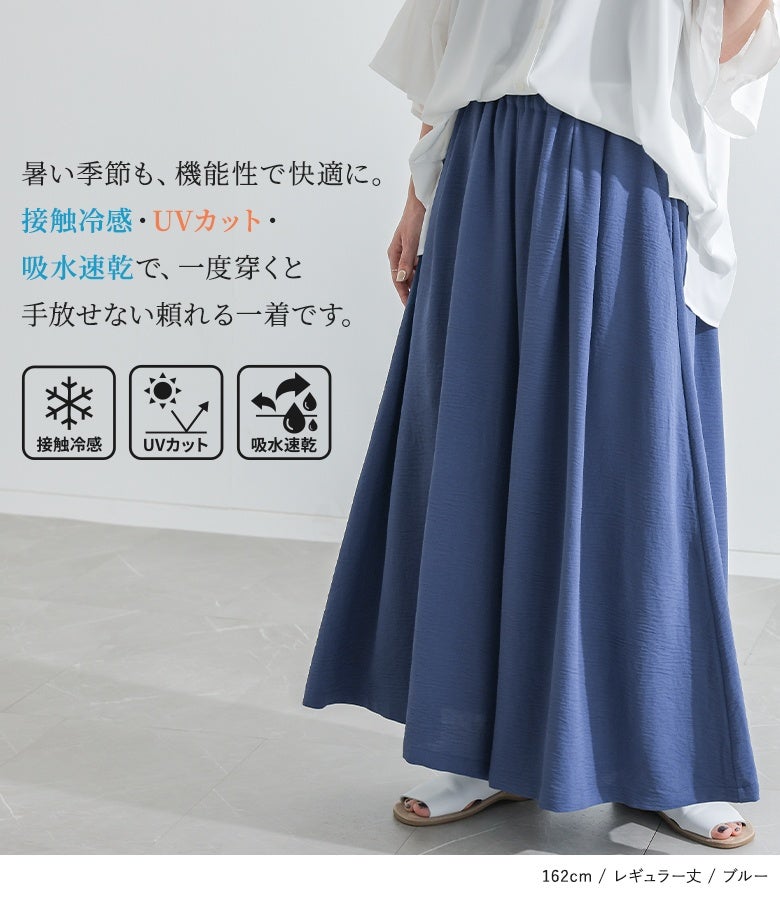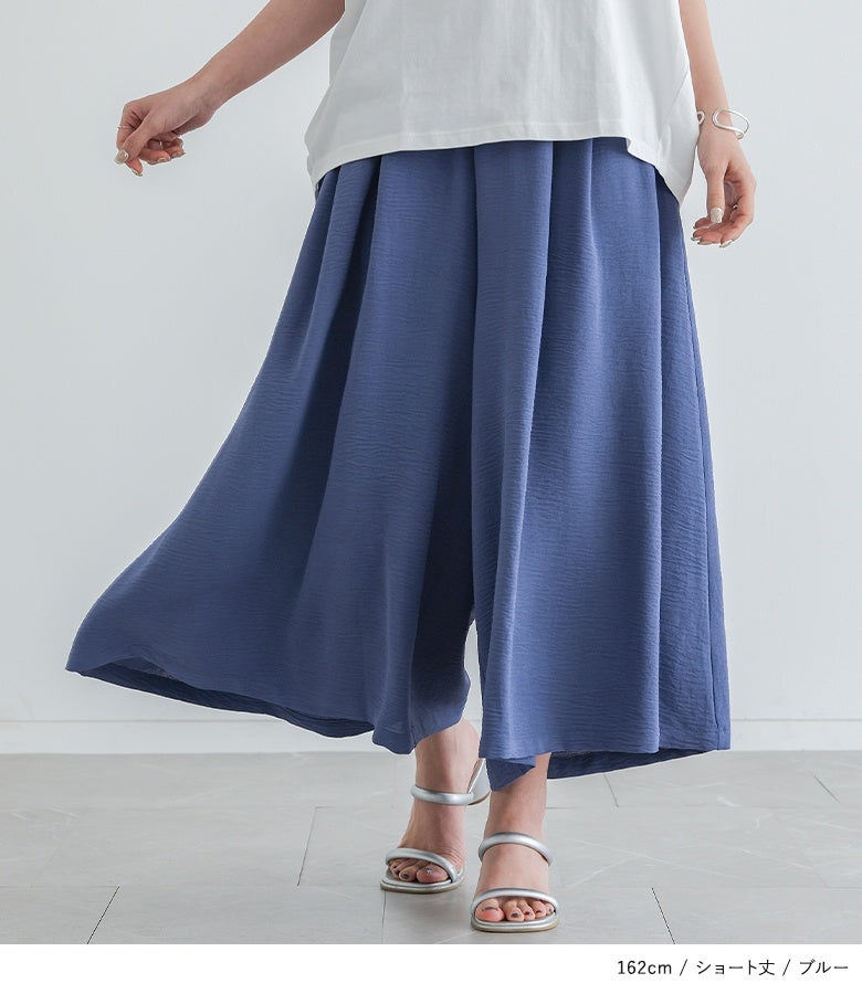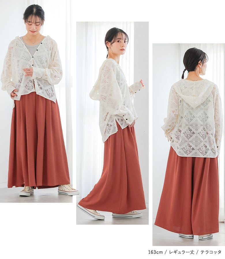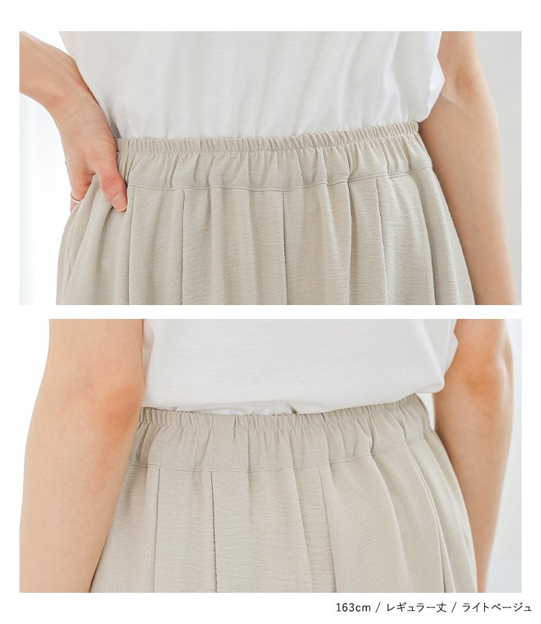 全体的にゆったりしたサイズ感で、ヒップの引っかかりもなし。ウエストも窮屈感ゼロで紐でしっかり留められるので、ずり落ちる心配もありません。シワになりにくく、旅行や長時間の移動にもぴったりです。レギュラー丈は大人っぽく着こなせます。