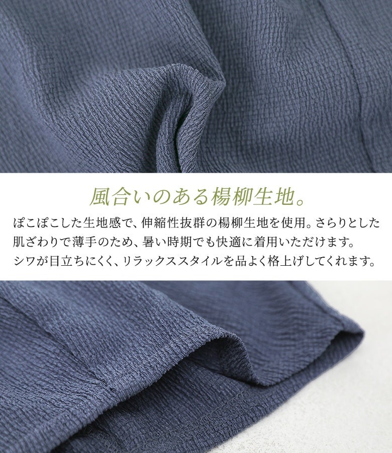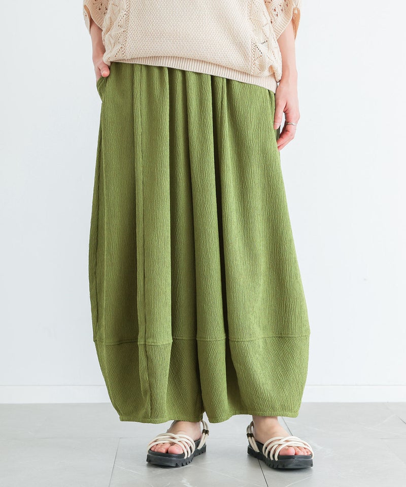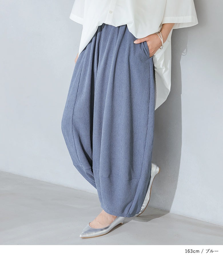 抑揚生地の風合いが特徴的な、軽やかな穿き心地のコクーンパンツ。