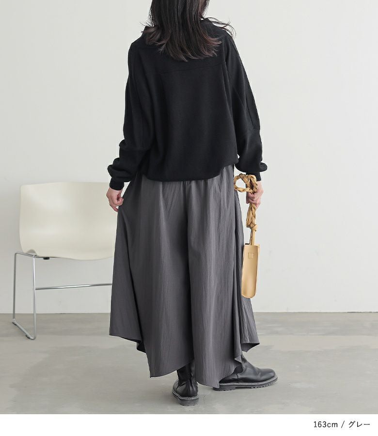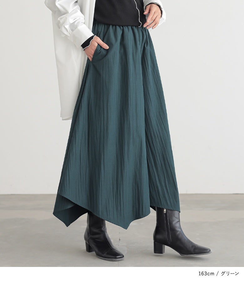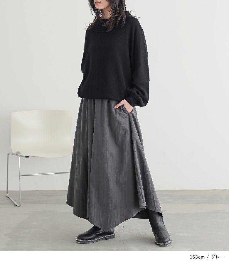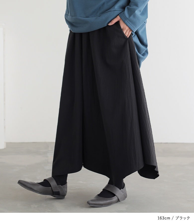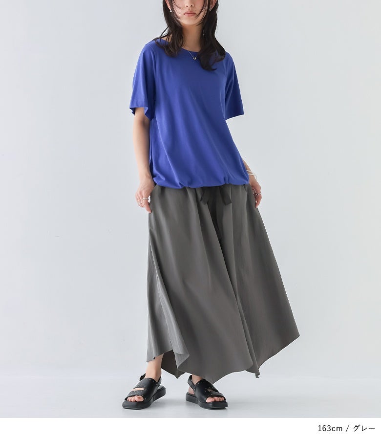 ウエストがゴム仕様で窮屈感なく着用できました。体型カバーも叶うのに、落ち感のある素材で上品見えするのが嬉しいです。