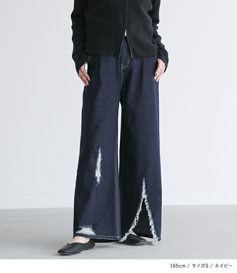 アシンメトリーのリップドデザインが魅力のデニムパンツ。カジュアルでありながらも風合いのある女性らしい肌見せで、大人カジュアルのスタイルに重宝します。ワイド風の裾デザインで脚長効果も期待できる一着です。