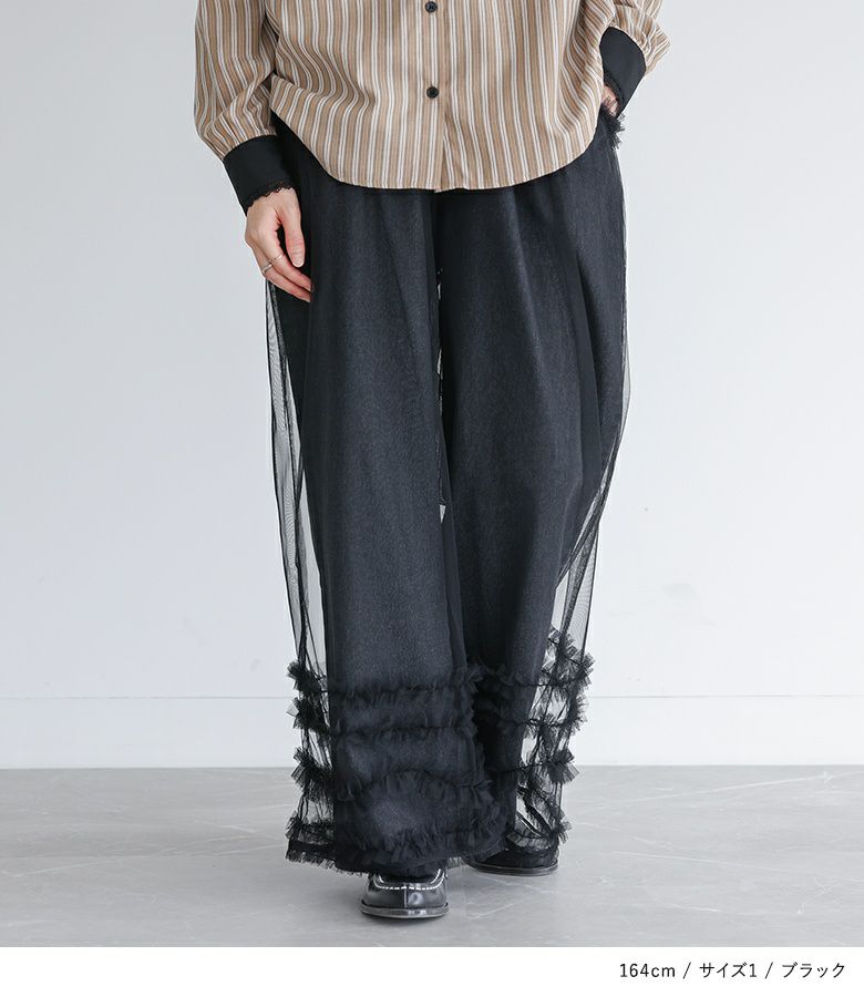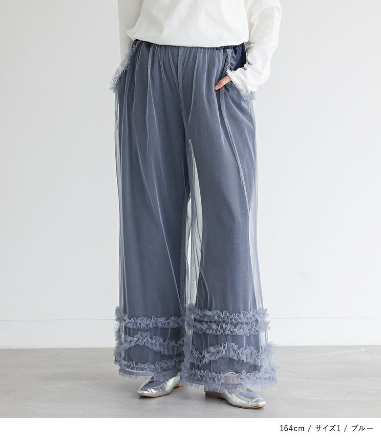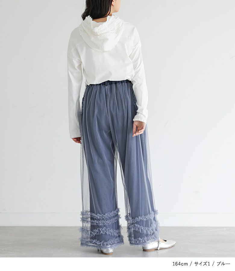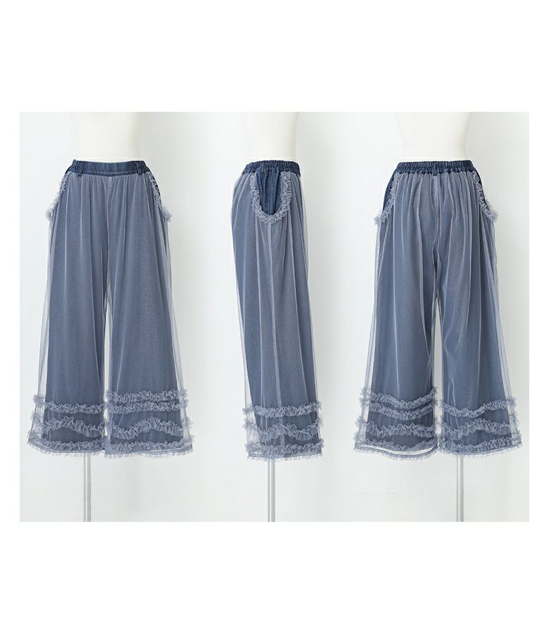 ウエストがゴム仕様で窮屈感なく着用できました。デニムの上にチュールを重ねたデザインがお気に入りです。