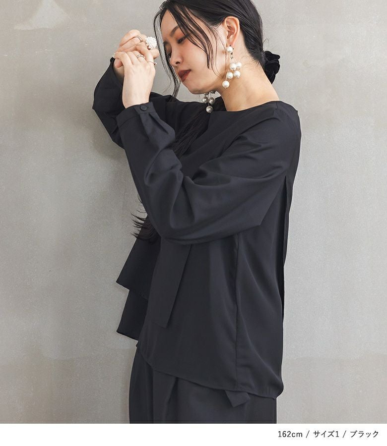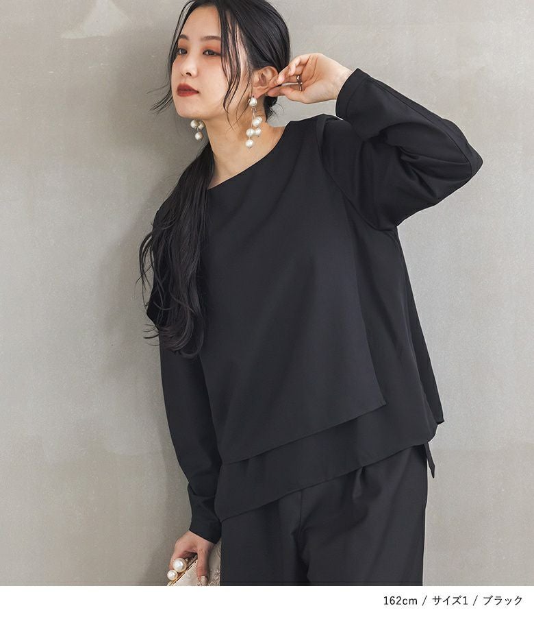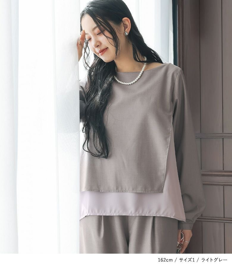 フォーマルもカジュアルな装いも一着でお洒落に決まる、さらっとしたハリのある上品なスーツ生地×とろみ感のある上質なシフォンのドッキングデザイン。