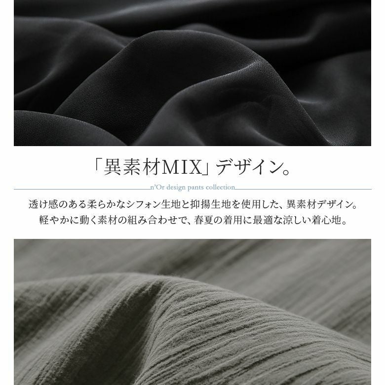 風をはらんでヒラッと動く、柔らかなシフォン生地と楊柳生地を重ねた異素材MIXデザイン。