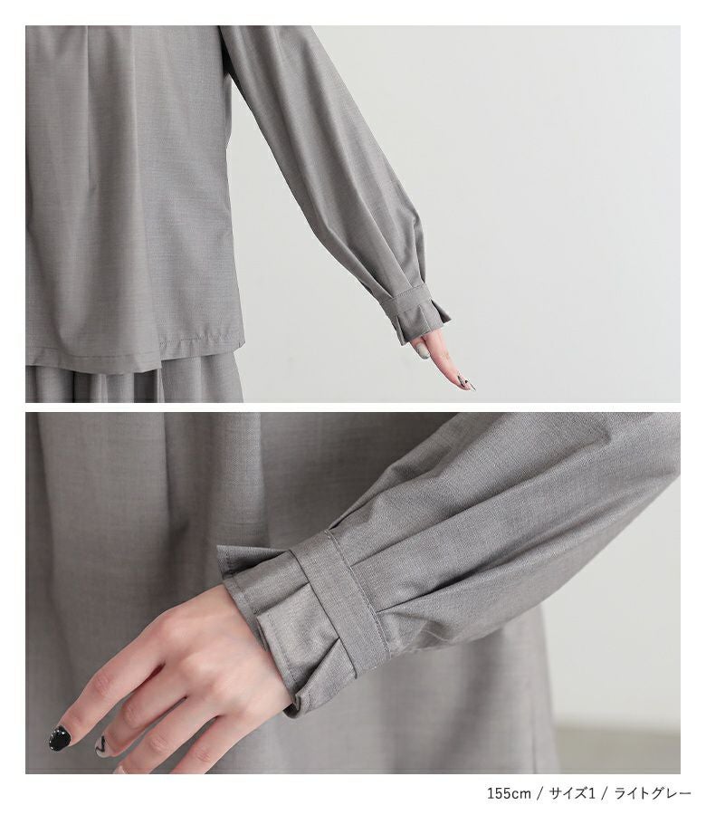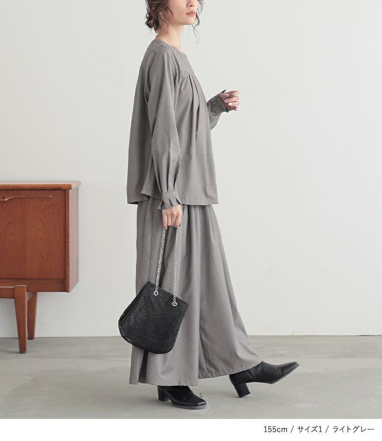 胸元と袖口のタックが立体的なデザインのトップスと、足首の見える丈感&ボリュームが出すぎないよう細かくタックを入れたガウチョパンツがスタイルアップを叶えてくれる。