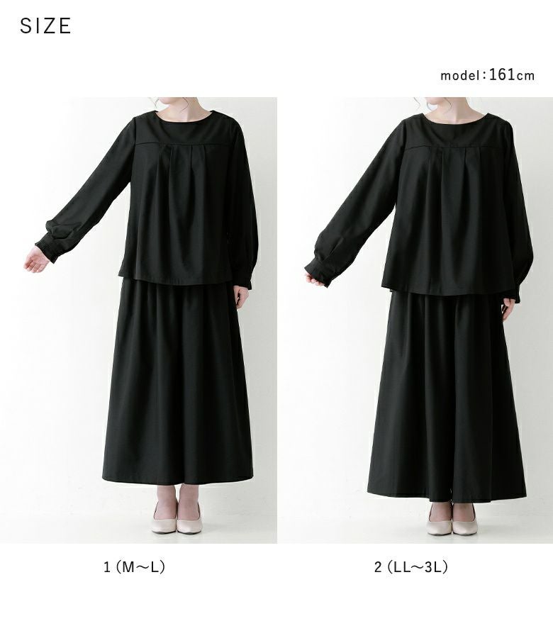 1(M~L)は、上下ともに体に沿わず、程よいゆとりがありますが、縦のラインでスッキリとしたシルエットで着られました。トップスをインして着るのもオススメです♪2(LL~3L)は、私には大きめのサイズ感で、パンツはウエストで留まらず丈が長くなるので、ヒールと合わせると安心です。私の場合は1(M~L)を選びます。