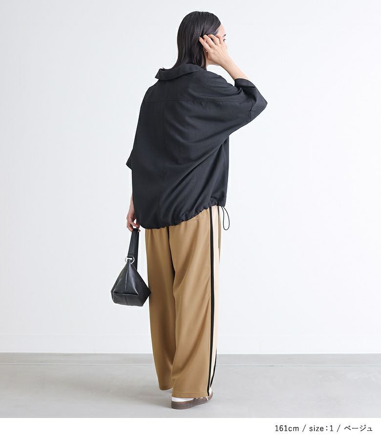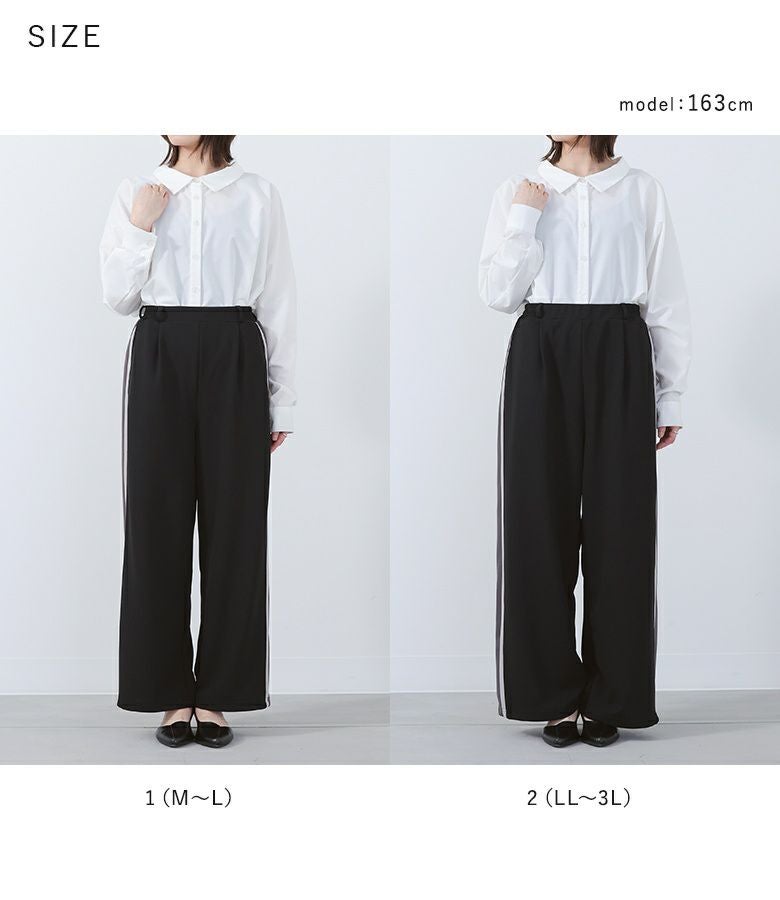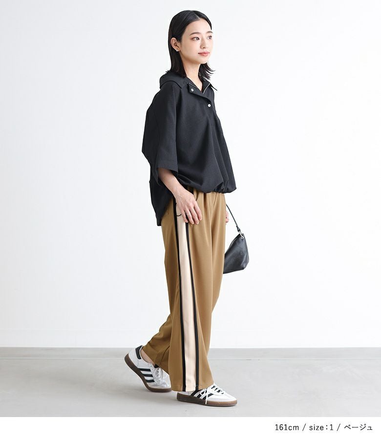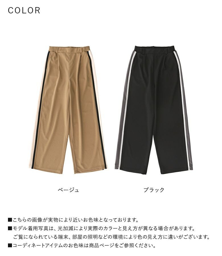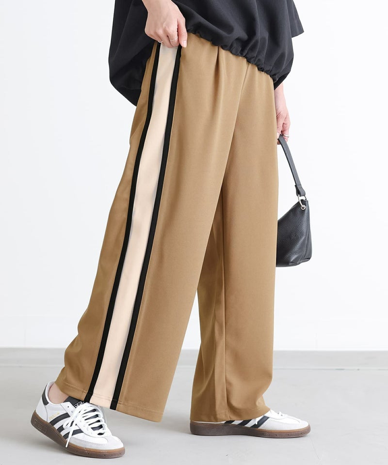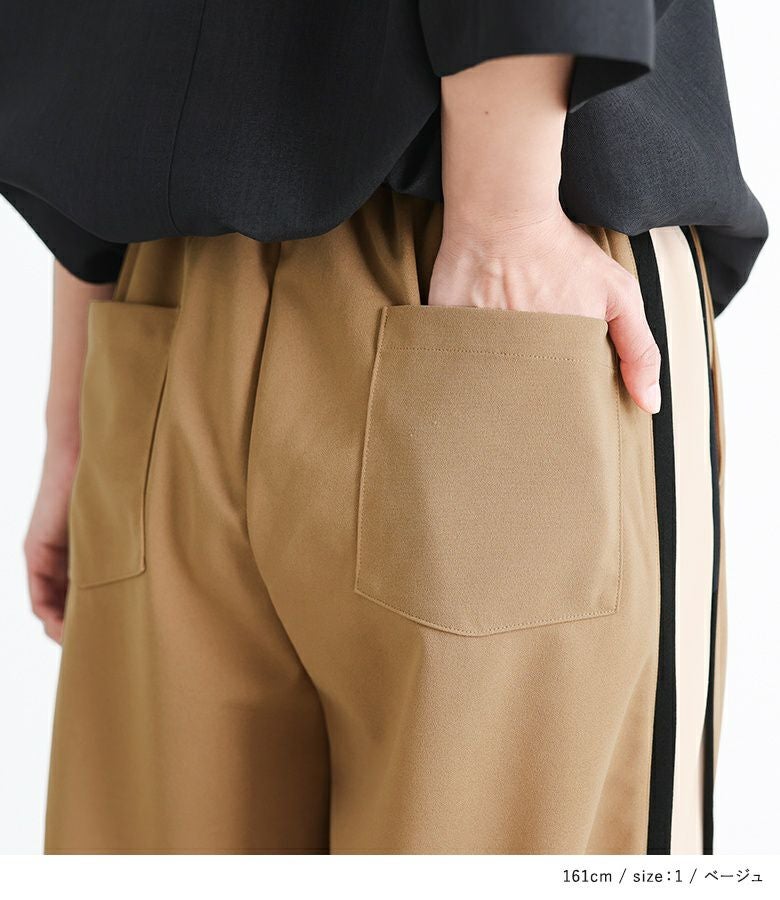 サイドの配色デザインがポイントになるストレートワイドパンツ。バックゴムとウエストヨーク・ウエストタックで、ラクに穿けてすっきり見える仕様になっています。