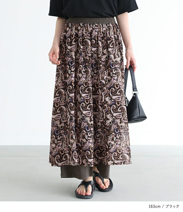 パンツは伸縮性のあるさらりとした肌触りのカットソー生地、スカートは透け感が軽やかな印象のシフォン生地を使用。異素材使いがお洒落なデザインです。スカートの柄はエスニック過ぎないニュアンス感のあるペイズリー柄で大人っぽくご着用いただけます。