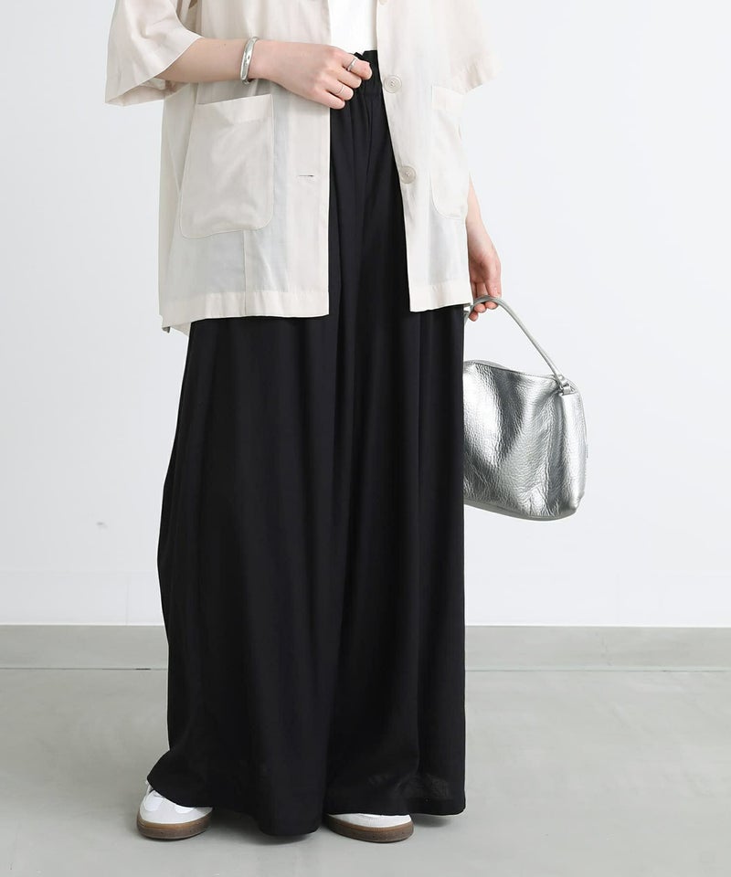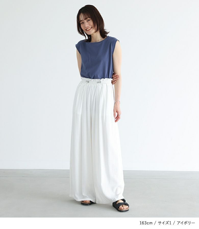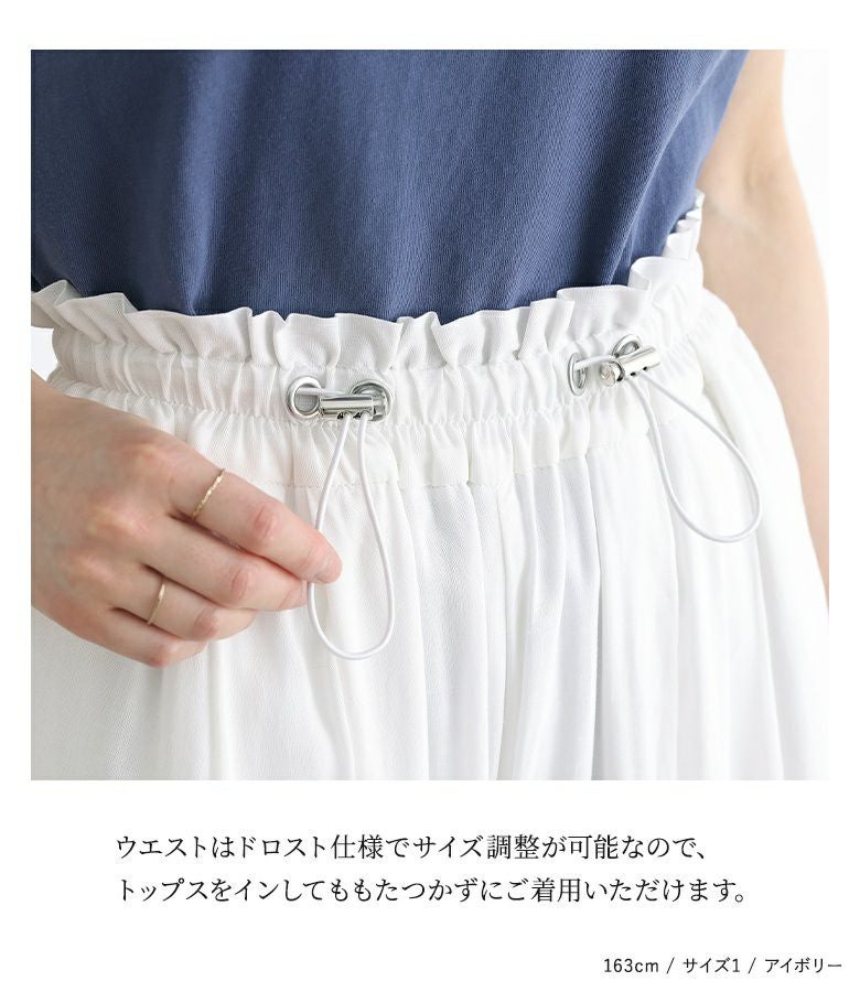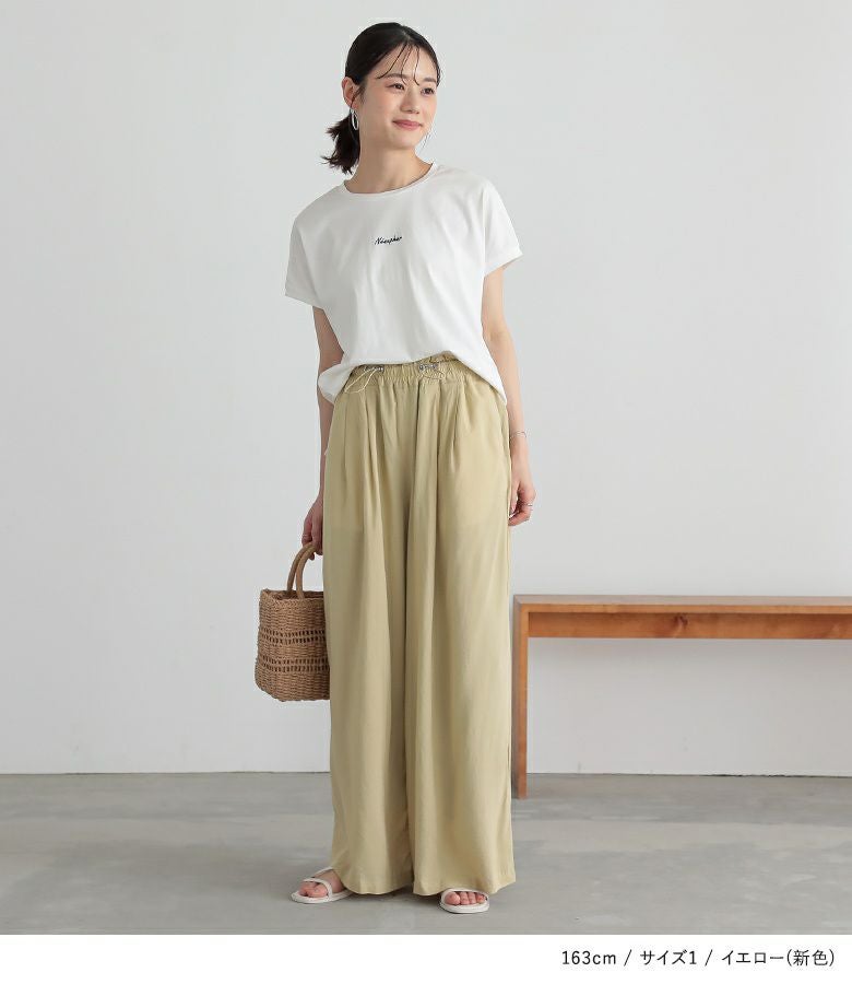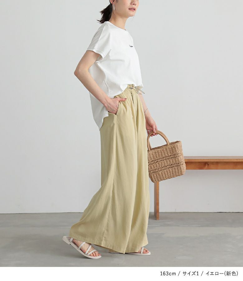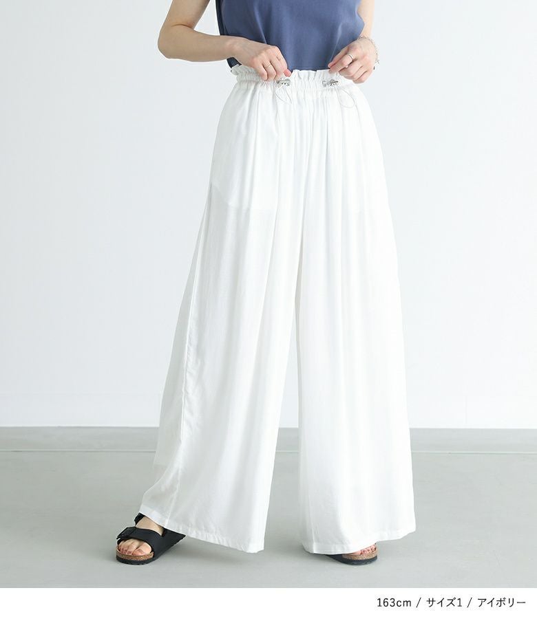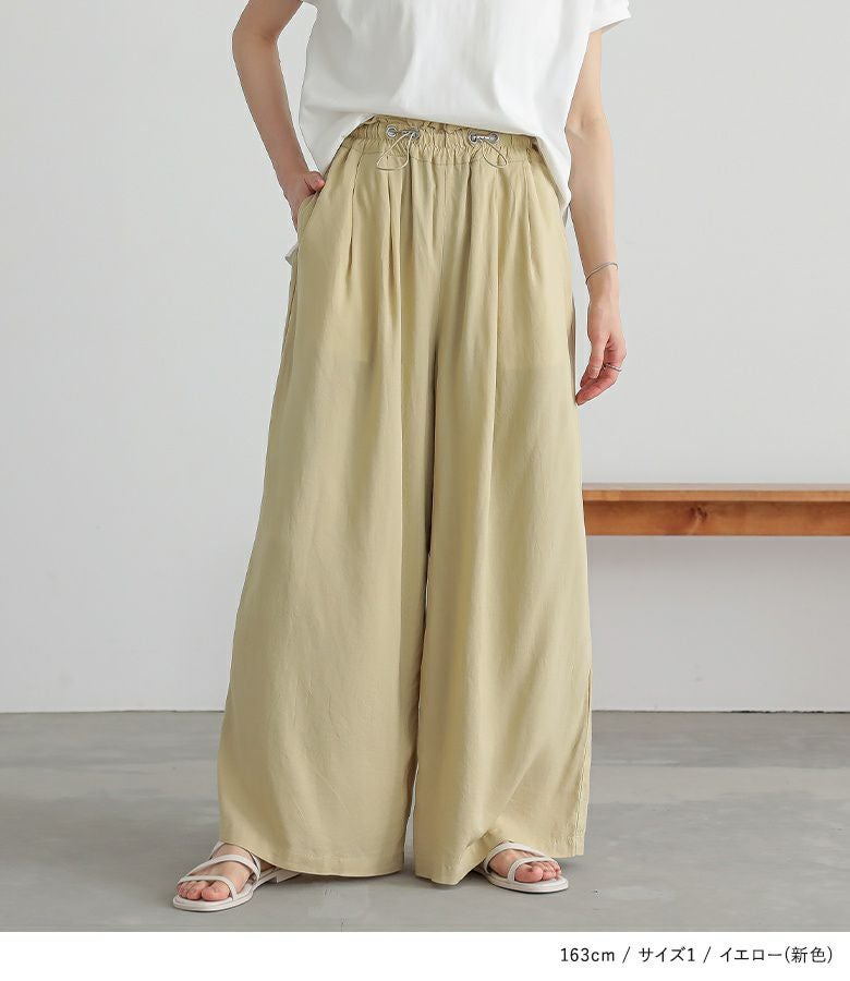 ウエストにドローストリングデザインを取り入れたワイドパンツ。落ち感のある生地で、ワイドシルエットでもボリュームを抑えてすっきりと着用できます。ウエストのドローストリングデザインでお好みのサイズに調整できます。ウエストタック入りでお腹回りもカバーします。