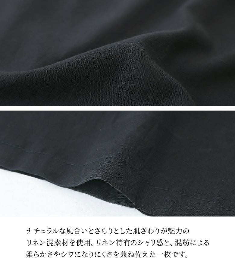 さらっとした肌触りの涼し気なリネン混素材。暑い時期でも快適に着用できます。滑らかな肌触りの裏地付き。