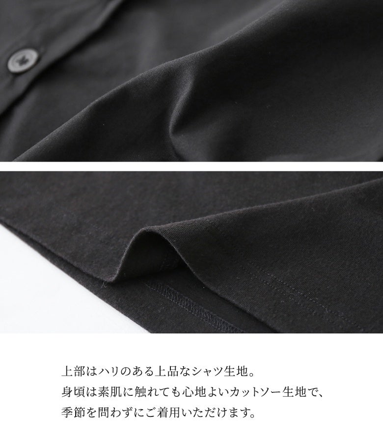 上部にはハリのある上品なシャツ生地を、身頃にはさらりと心地よいカットソー生地を使用した、こだわりの異素材使い。
