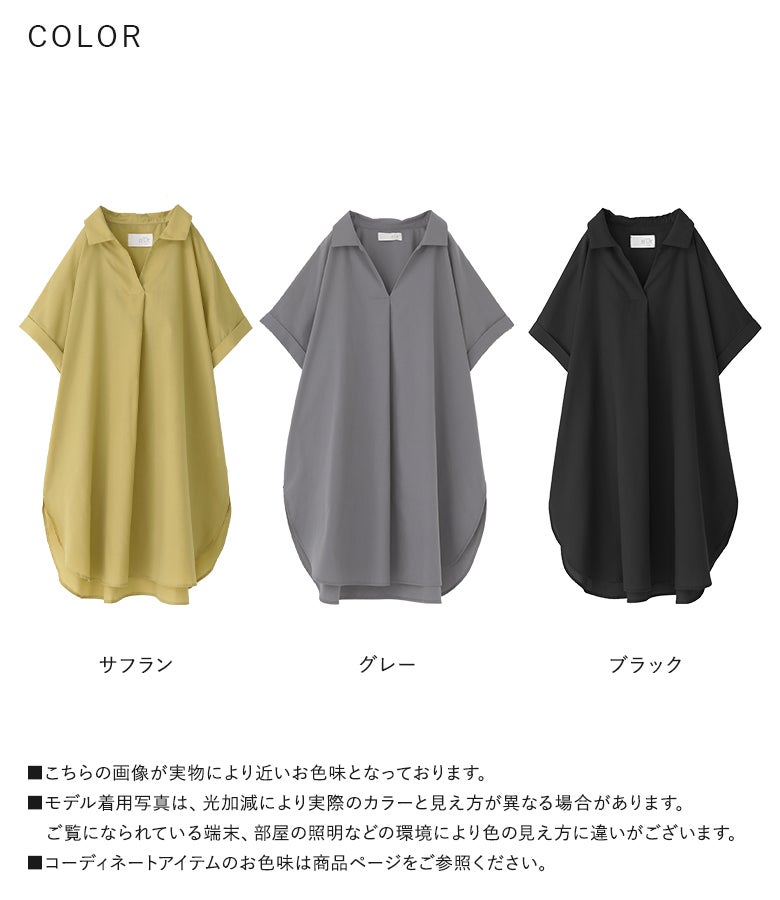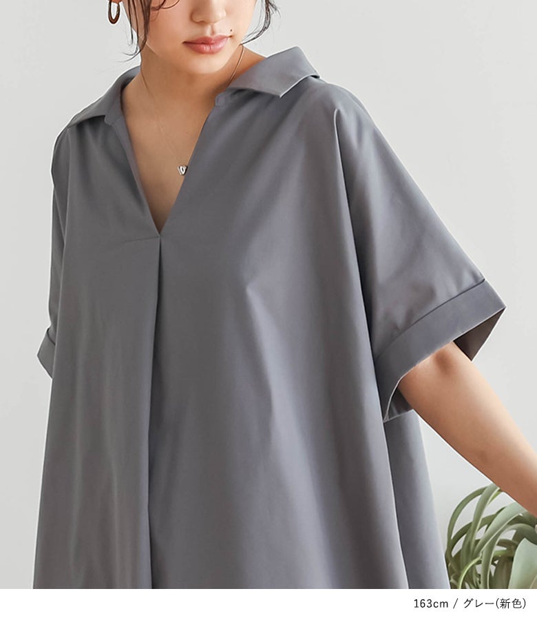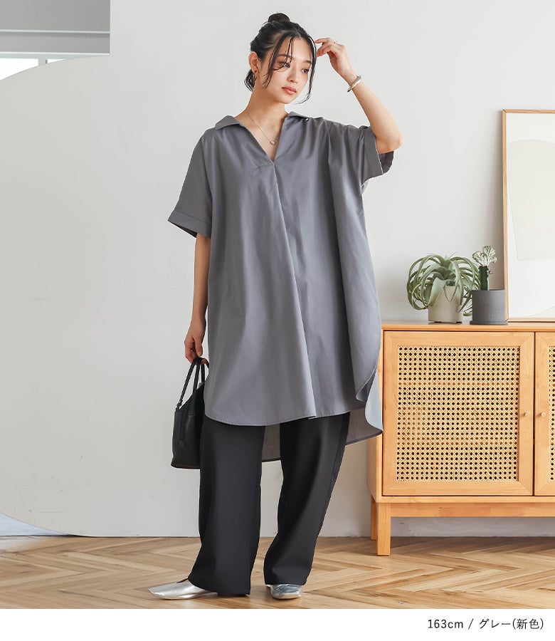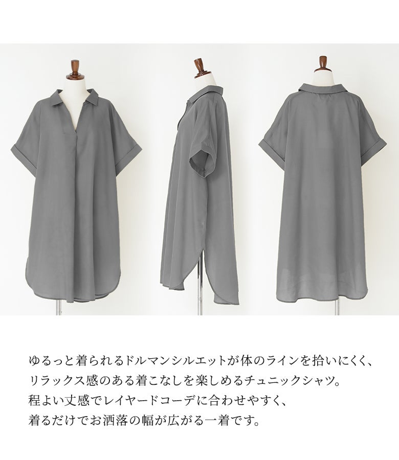 スキッパー襟で抜け感を演出する、ゆるっとお洒落なチュニックブラウス。二の腕をカバーするこだわりの袖デザインも、大人女子のコーデの味方になるポイントです。