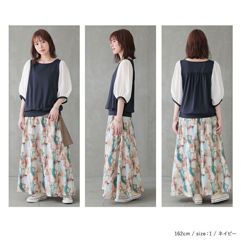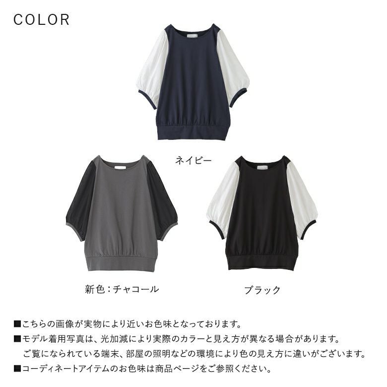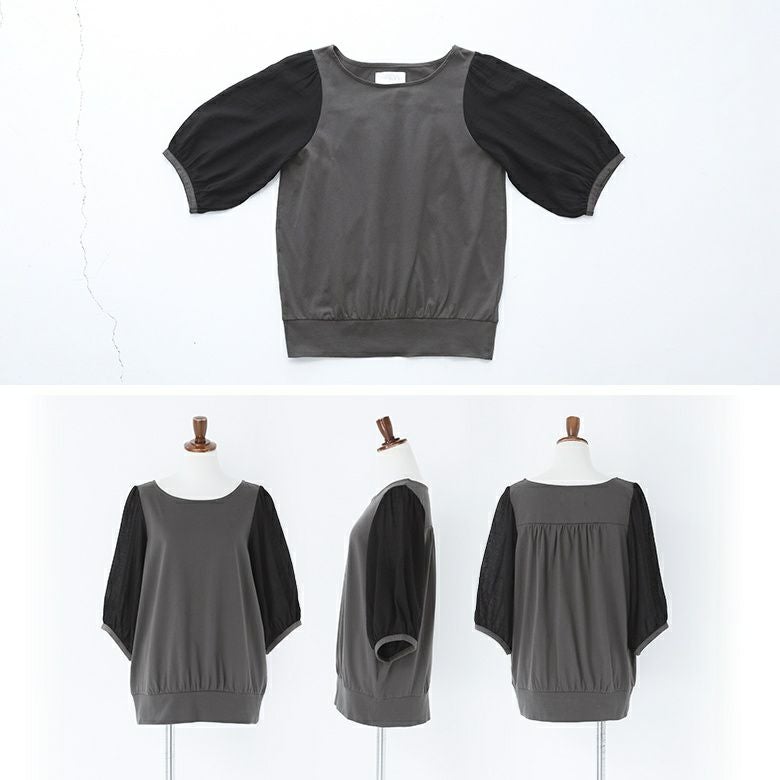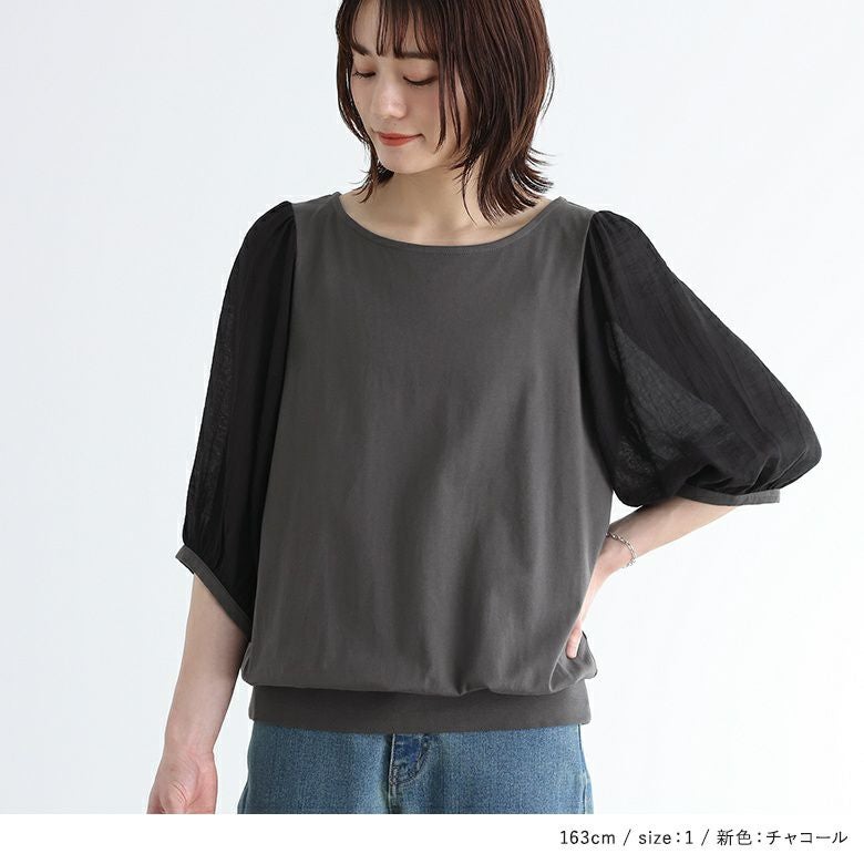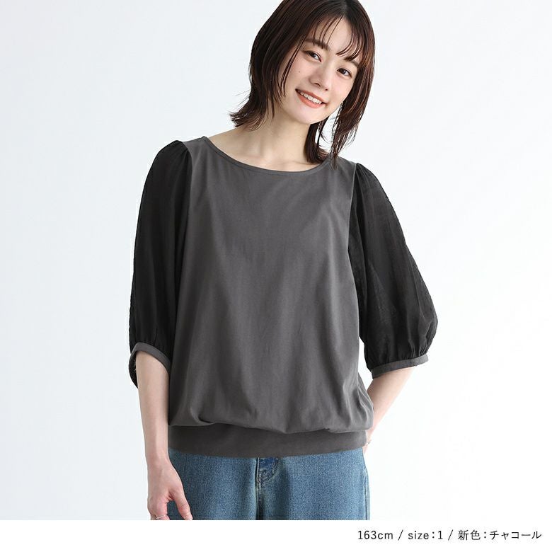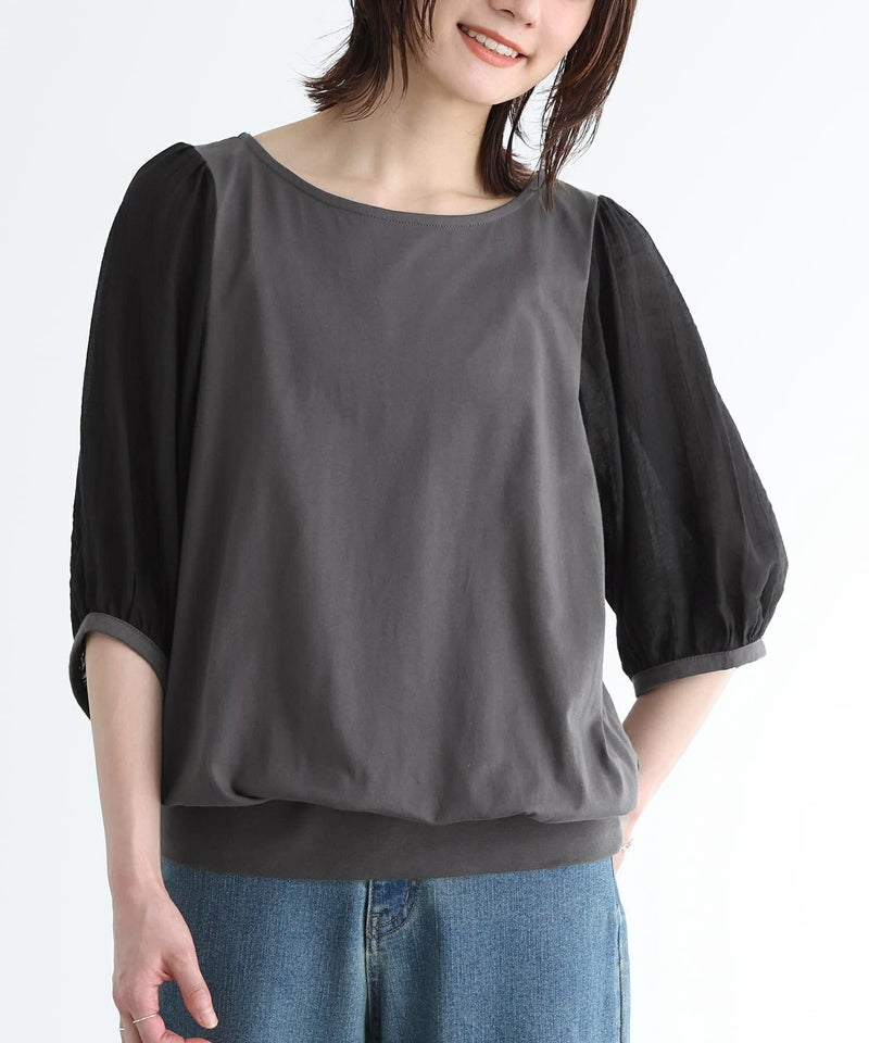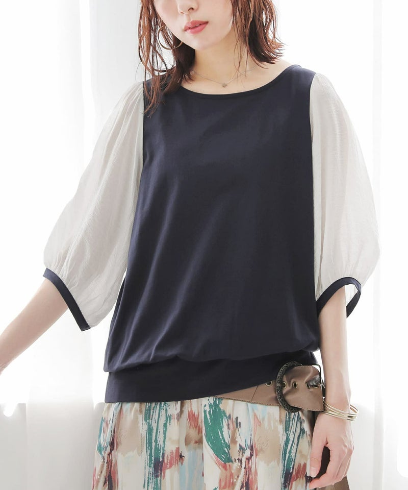 透け感が涼しげなぽわん袖が目を惹く、シアー袖×カットソーの異素材デザイン。気になるところはしっかり隠す6分袖も嬉しいポイントです。