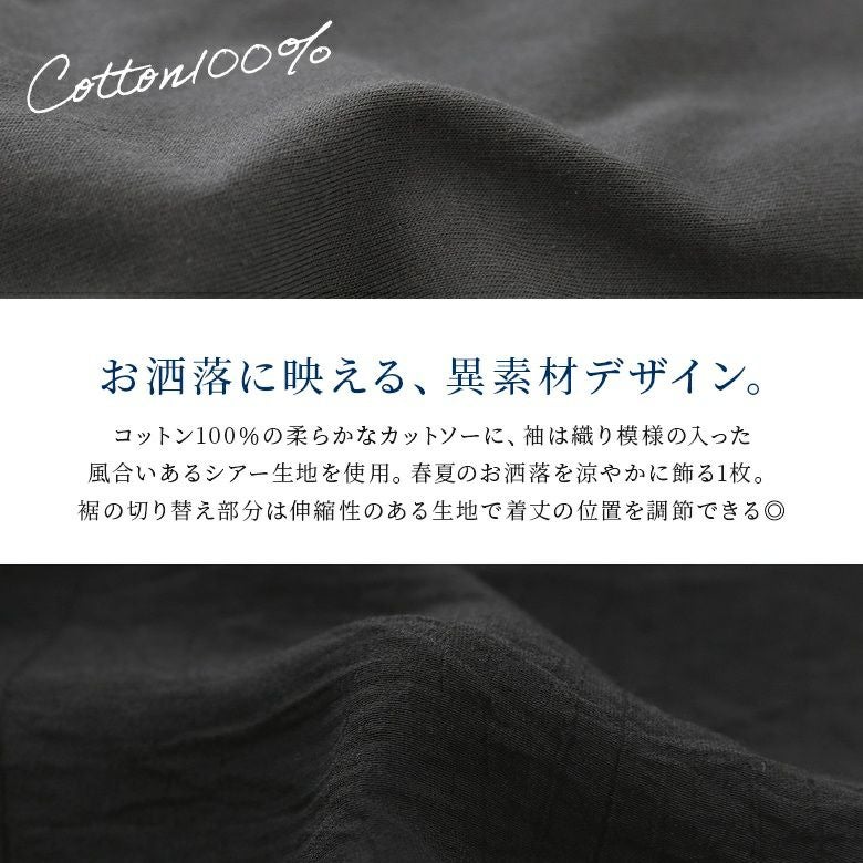 コットン100%の柔らかなカットソーに、袖は織り模様の入った風合いあるシアー生地を使用。お洒落を涼やかに飾る1枚です。