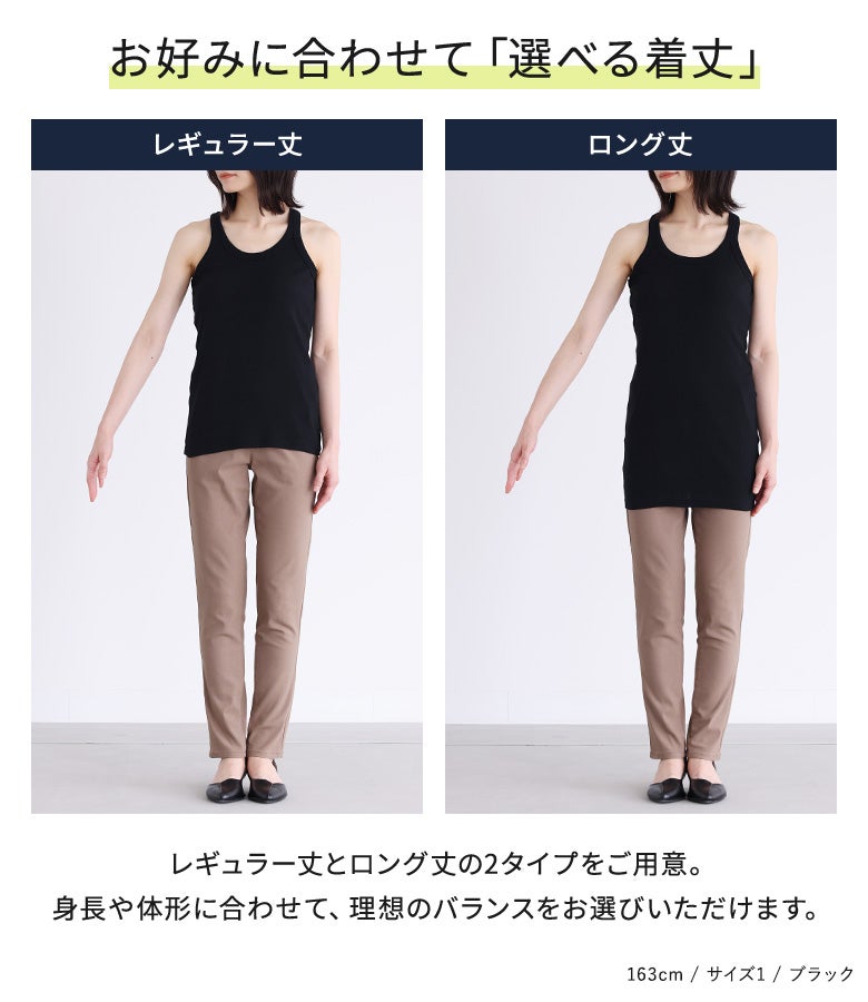 【普段着用】 Tops: L/LL Bottoms: L/LL | 【1】 [レギュラー丈]着丈:ヒップ真ん中位 [ロング丈]着丈:太もも真ん中より上位 腕周り:ややゆったり バスト:ジャスト 全体:スッキリ