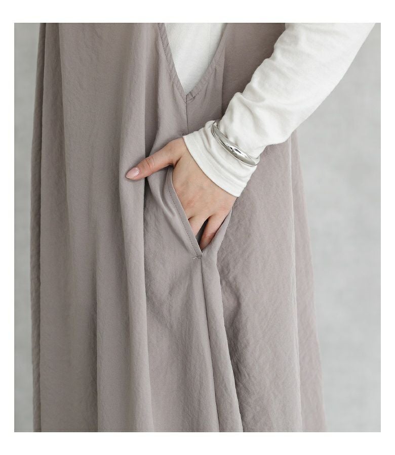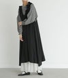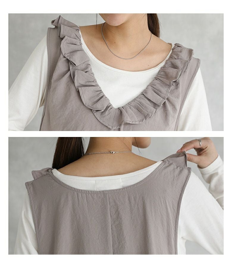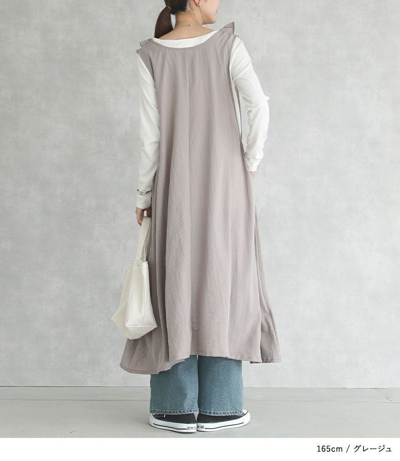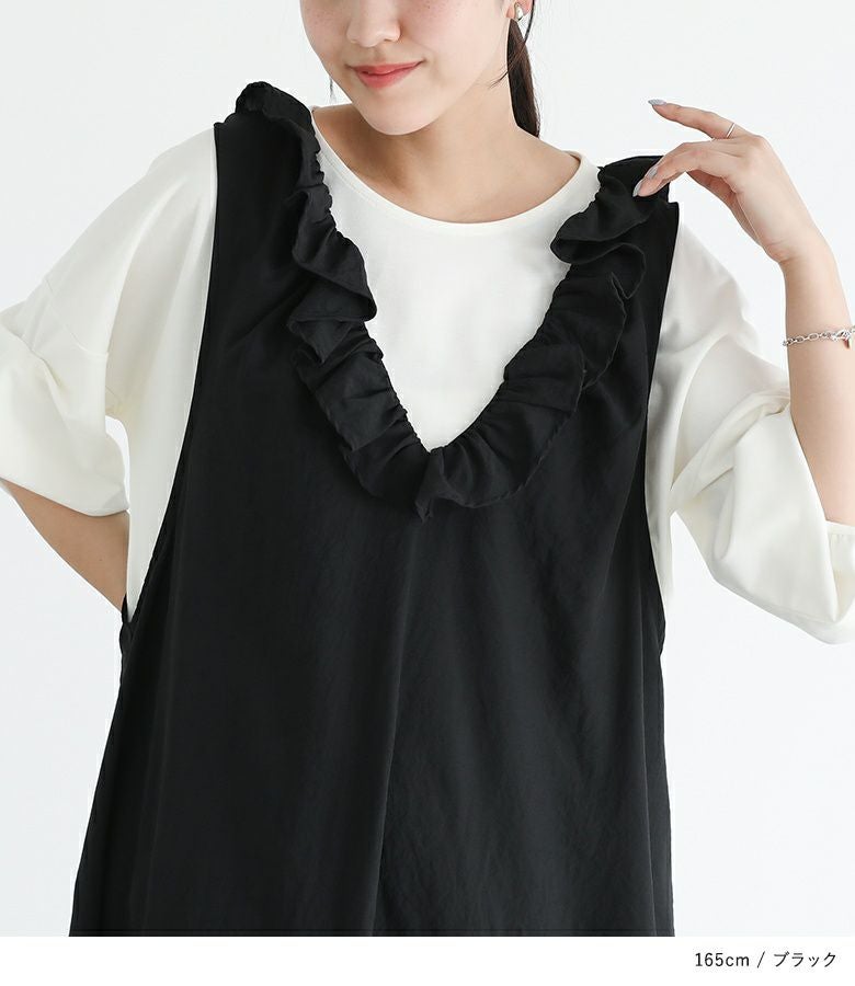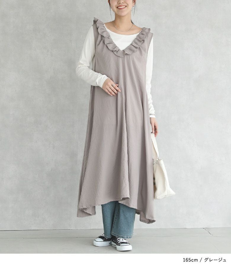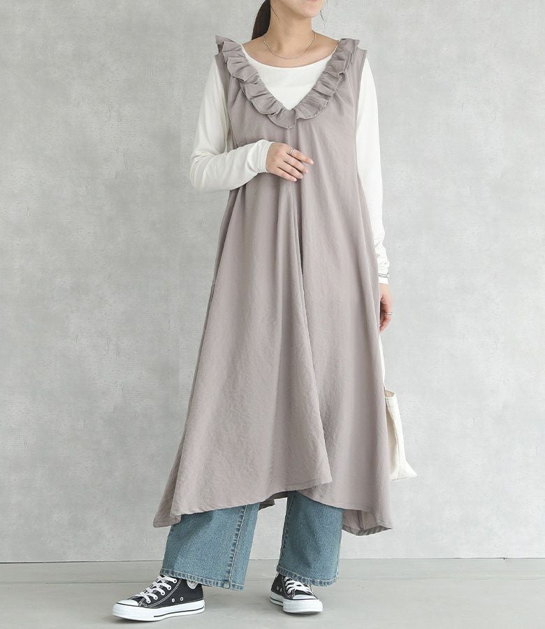 肩のフリルが大人可愛い雰囲気を演出するジャンパースカート。フリルは派手すぎず、デイリーコーデにも取り入れやすいのが特徴です。