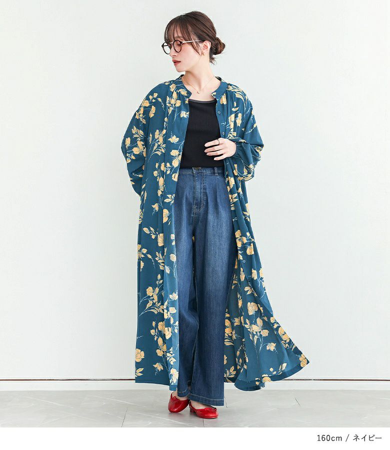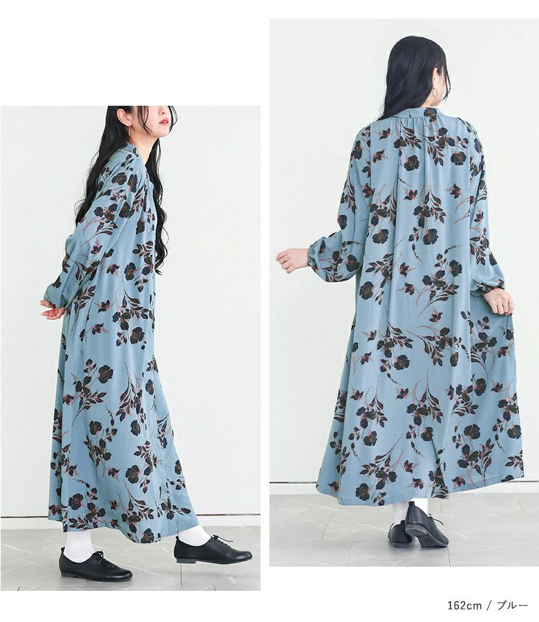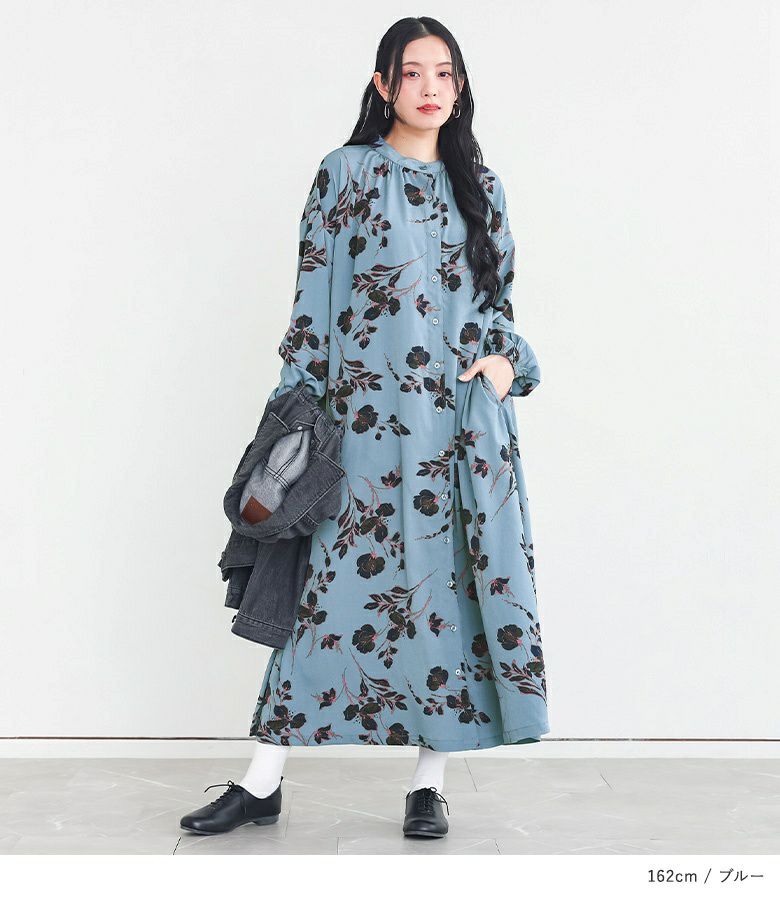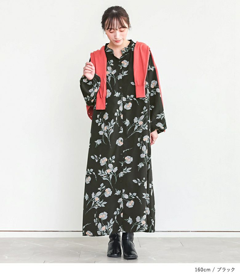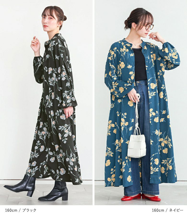 ブルーを購入。身長163センチですが丈は丁度良い感じです。前を開けて羽織りにもできるのでワンピースはもっぱら前開きを購入するようにしています。ブラックは合わせやすいし、無難かな?と思いましたが、ブルーの色味と柄が気に入ってセール価格の時に買ってしまいました🥰