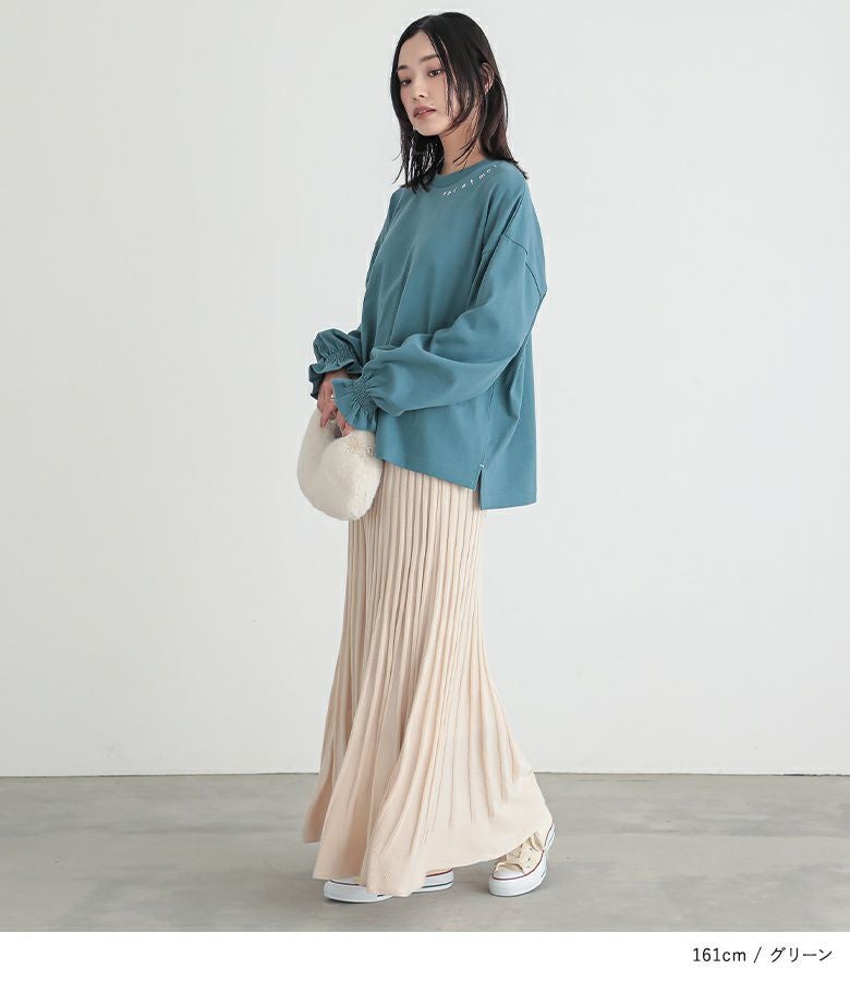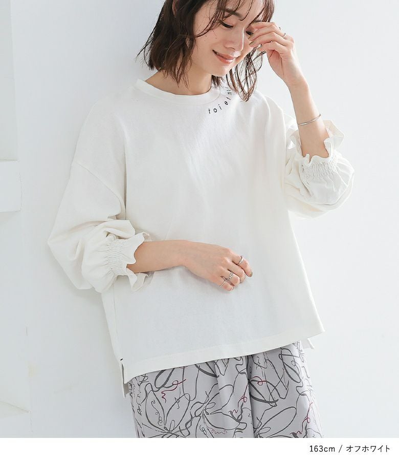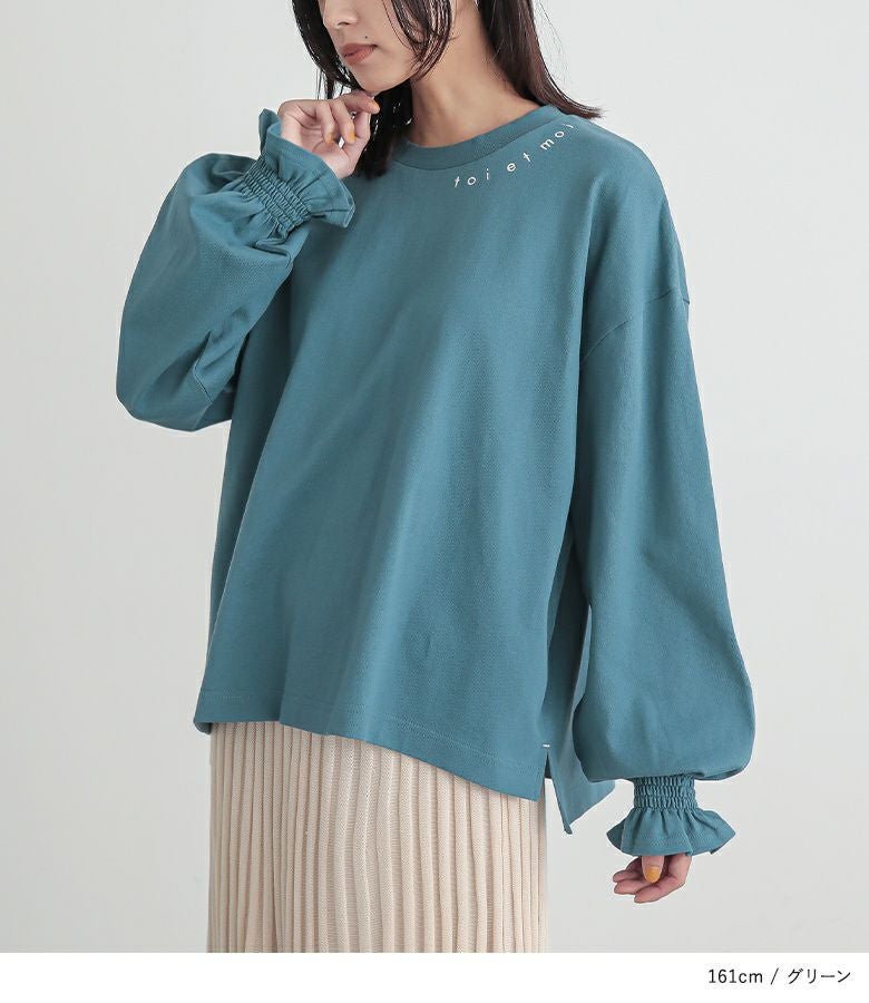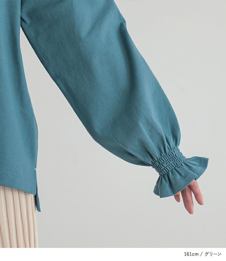 ややゆったりとした着用感です。袖のフリルがアクセントになっていて可愛いです。