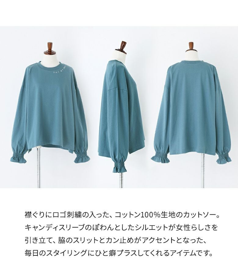 襟ぐりにロゴ刺繍の入った、コットン100%生地のカットソー。