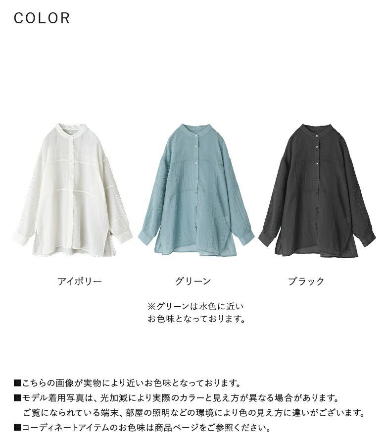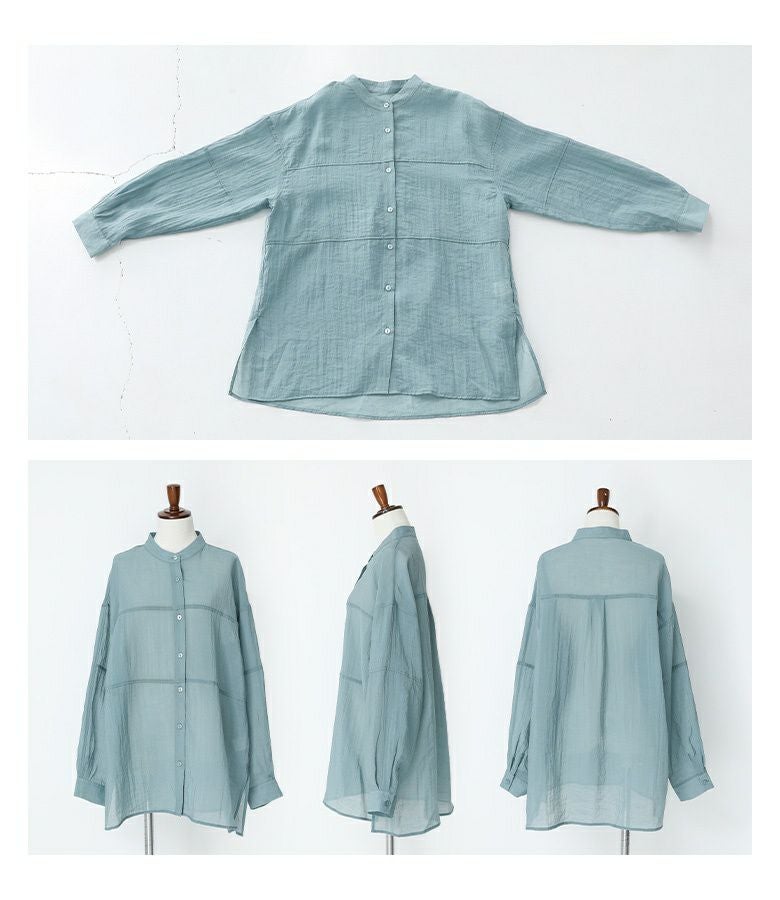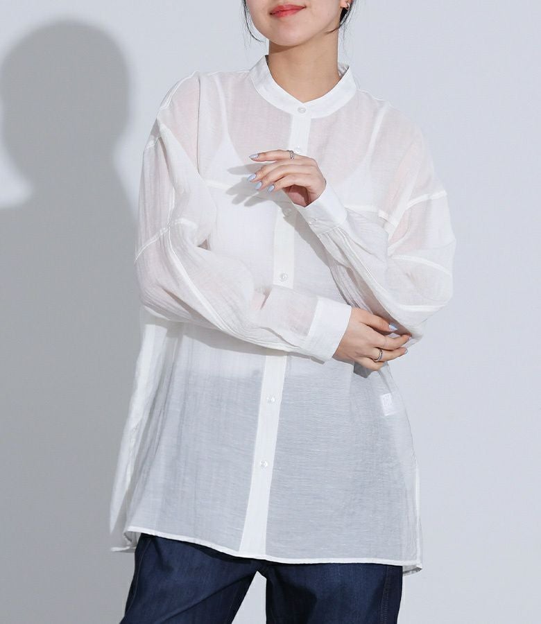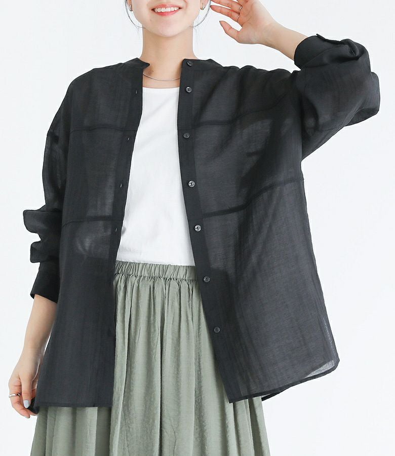 切り替えのデザインがさりげないポイントになったシンプルなバンドカラーシャツ。ゆるっとしたシルエットで、程よい上品な透け感があるのでラフにさらっと着られるのがポイントです。