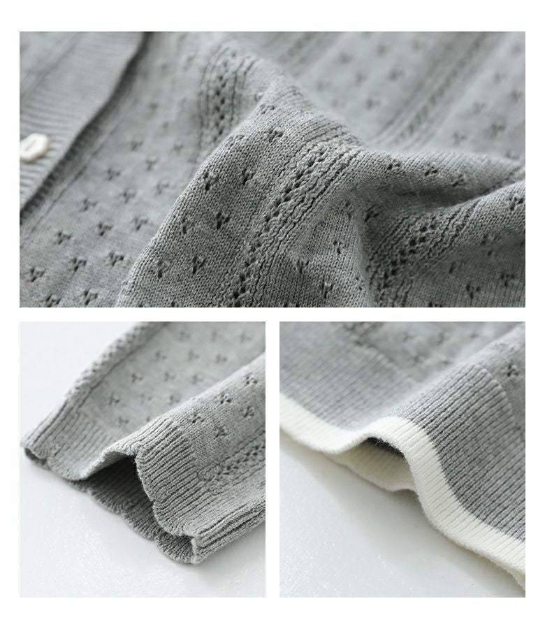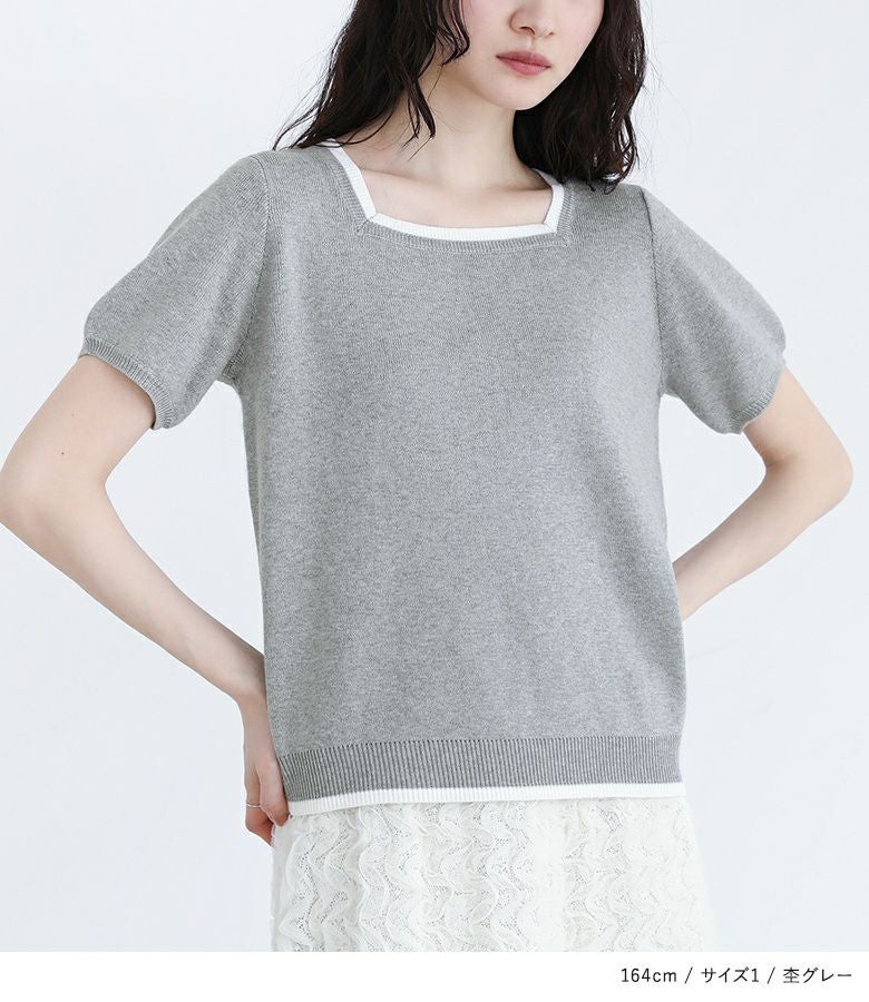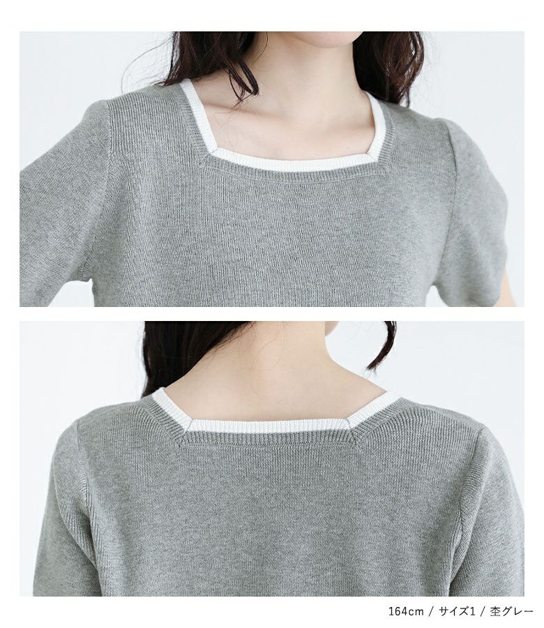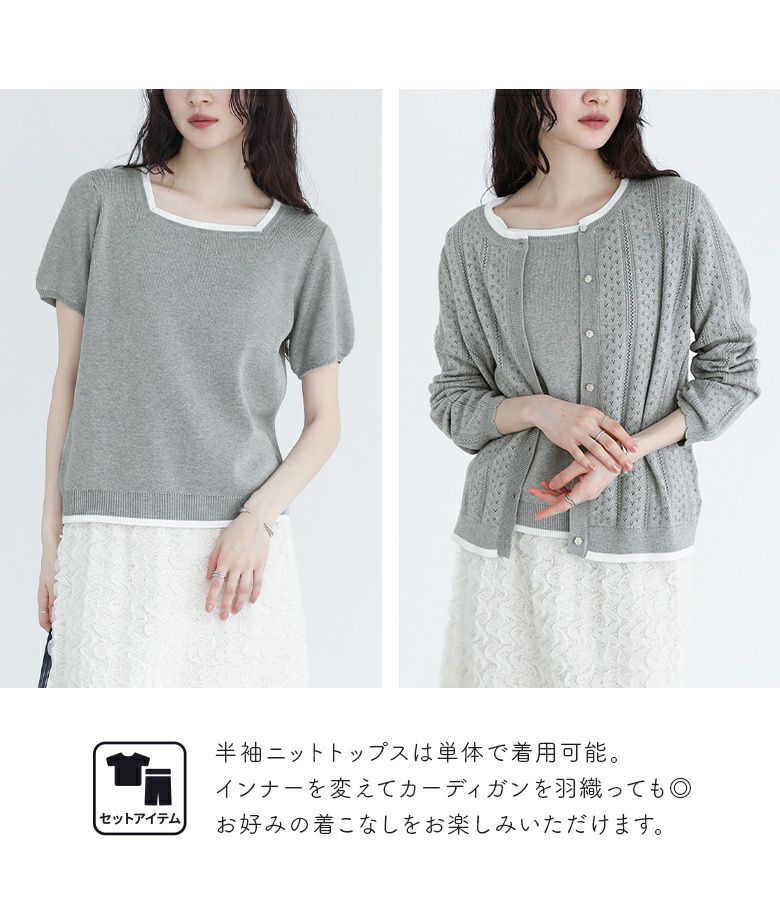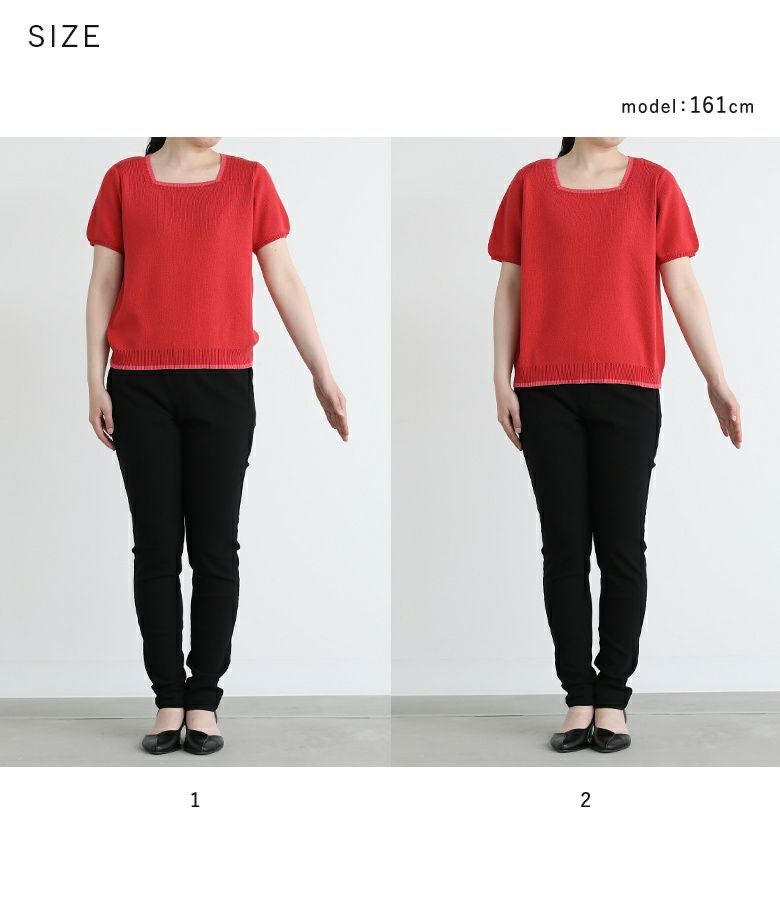 【普段着用】 Tops: M Bottoms: S/M | 【1】 袖丈(長袖カーディガン):手の甲が隠れる位 袖丈(半袖ニット):ひじ上10cm位 着丈:ヒップにかかる位 腕周り:ややゆったり バスト:ややゆったり 全体:ややゆったり