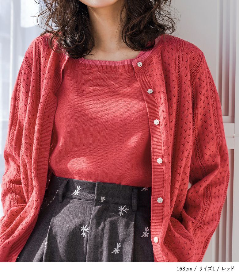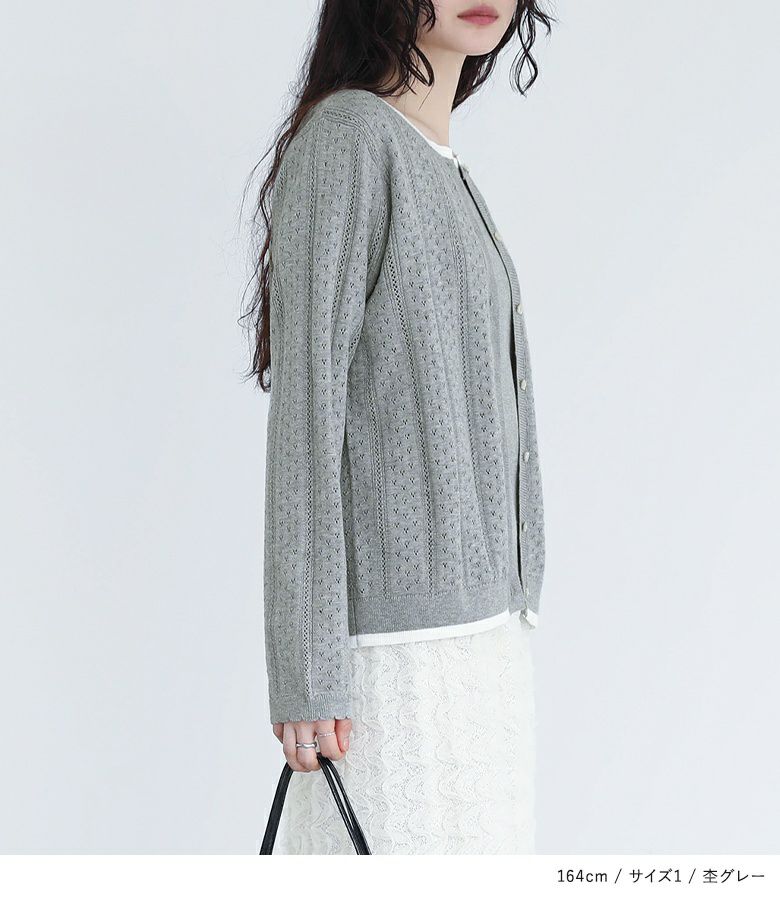 【普段着用】 Tops: L Bottoms: L | 【2】 袖丈(長袖カーディガン):手の甲が隠れる位 袖丈(半袖ニット):ひじ上15cm位 着丈:ヒップ真ん中位 腕周り:ゆったり バスト:ややゆったり 全体:ややゆったり