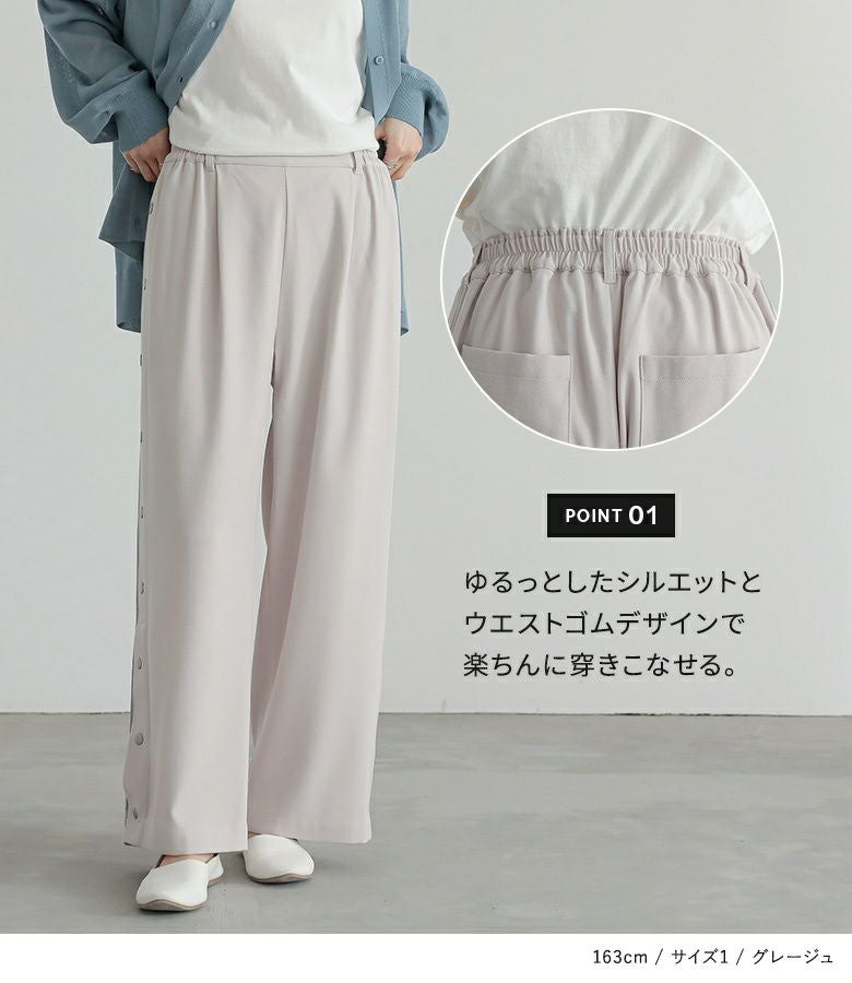 サイドの配色ライン&ドットボタンがポイントのパンツ。ゆるっとしたシルエットでラフに穿ける一枚。ウエストベルトの前中心にはギャザーを寄せず、トップスをインしてもすっきり見えする仕様にしました。バックには便利なパッチポケット付き。