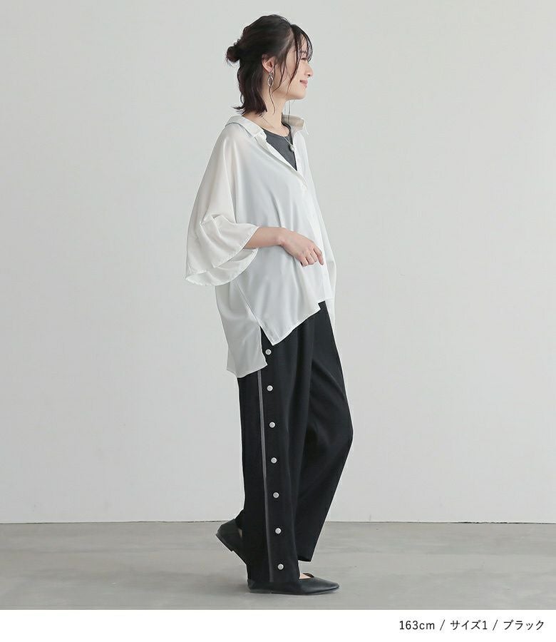 シンプルな中に配色ラインとドットボタンのデザインが効いたアイテムで、大人カジュアルな着こなしを叶えます。ブラックはモードなスタイリング、グレージュは女性らしい柔らかな雰囲気のスタイリングにもおすすめです。ドットボタンは開閉可能のため、裾をいくつか開けてスリット風にアレンジもできます。