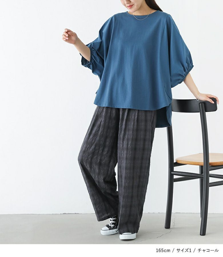 【普段着用】 Tops: M Bottoms: S/M | 【1】 着丈(ウエスト穿き):かかとから5cm余る位 ウエスト:ややゆったり ヒップ:ゆったり 太もも周り:ゆったり 全体:ゆったり