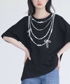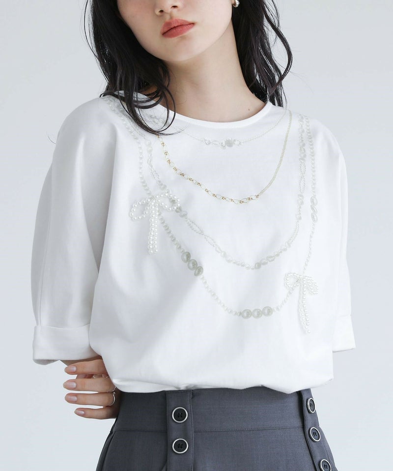 パールネックレス風の転写プリントを施したTシャツ。フェイクパールで作ったリボンモチーフがポイントになったデザインです。袖口は折り返した仕様に。