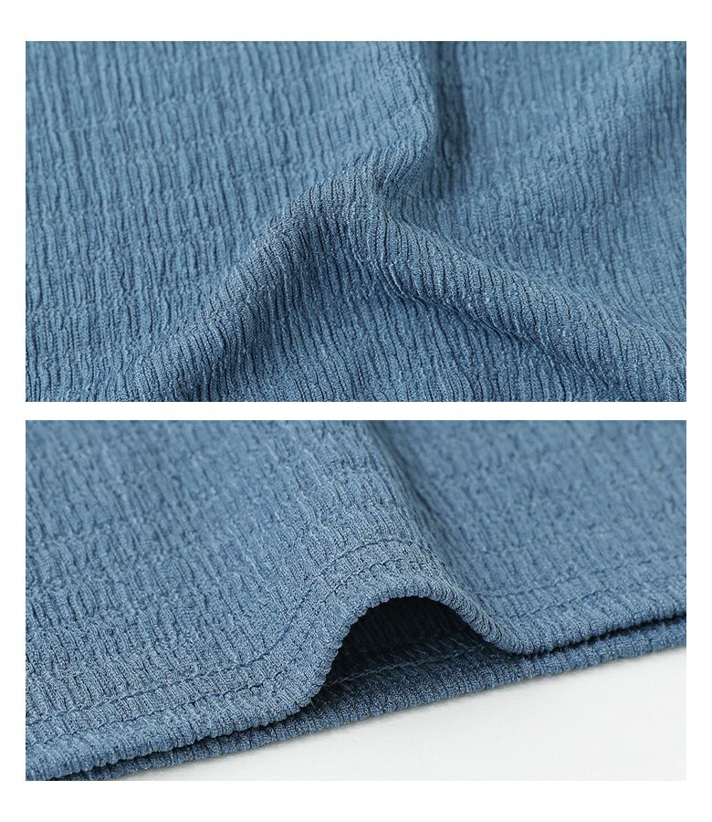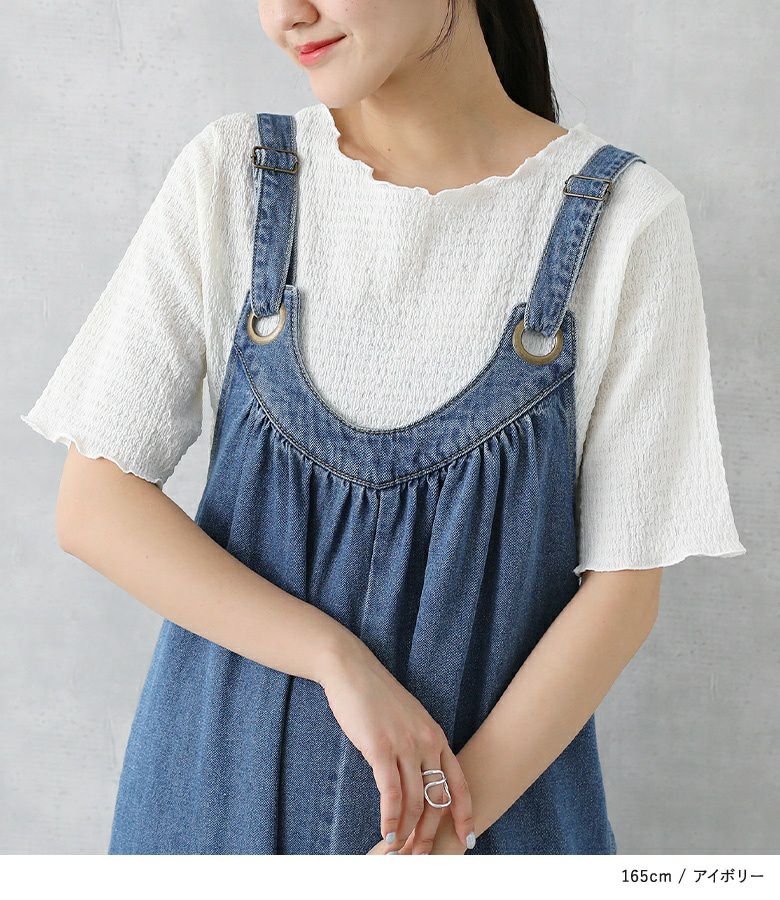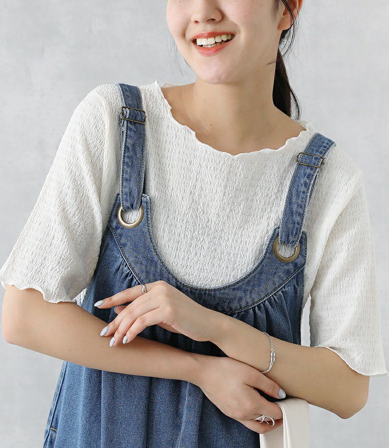 大人が着やすいぽこぽことした凹凸感がポイントのシャーリングトップス。凹凸感のある生地なので身体のラインが響きづらく、袖口も広めなので二の腕をカバーしてくれるのも嬉しいポイントです。