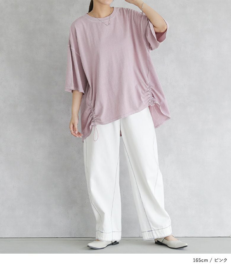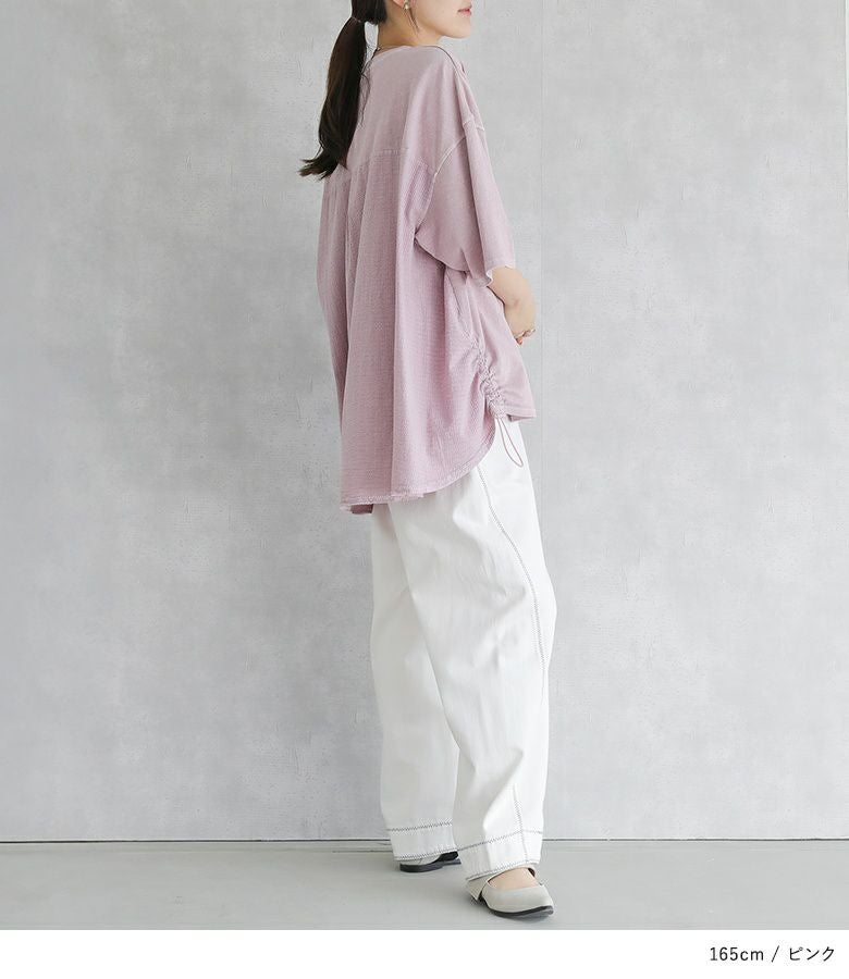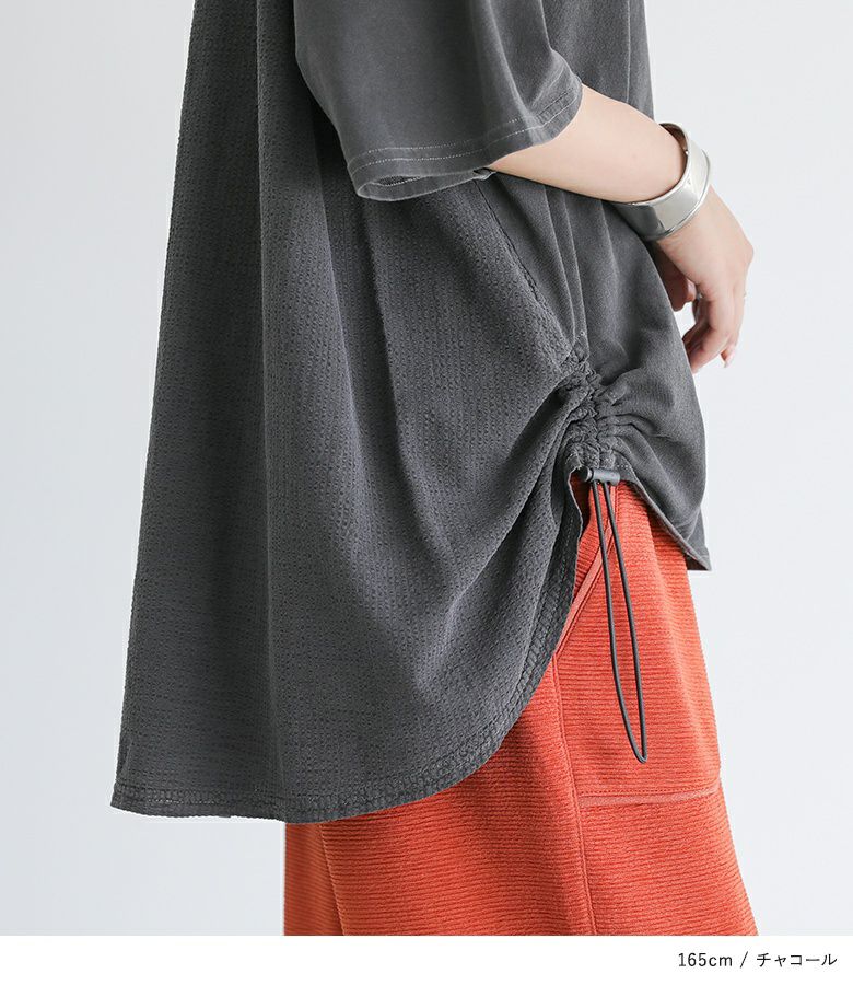 周りと差のつく異素材切り替えドロストチュニック。特徴的な裾のドロストデザインがポイントでシルエットが自由に変えられます。背中は涼しげな異素材とセンタータックでスッキリ見えを叶えてくれます。