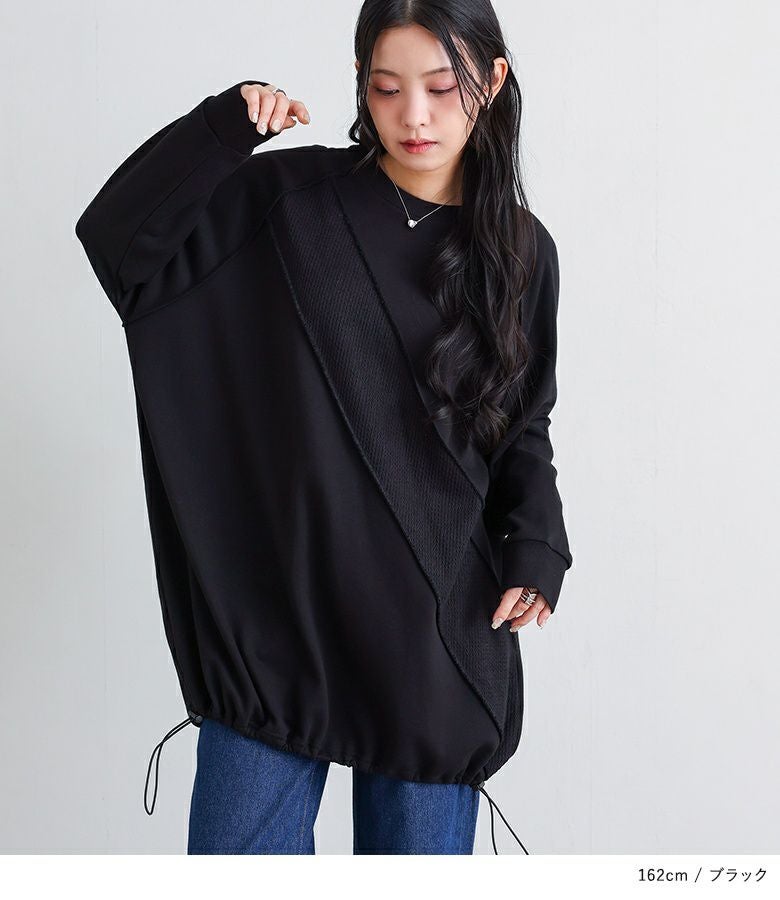 着丈が長めで体型カバーが叶う、異素材切り替えのチュニック。前身頃には斜めに入ったニットの切り替えデザインが施されており、すっきりと見せる視覚効果がポイントです。両サイドにはコードストッパーが付いており、裾のシルエットを自由に調整可能。センスが光る一着です。