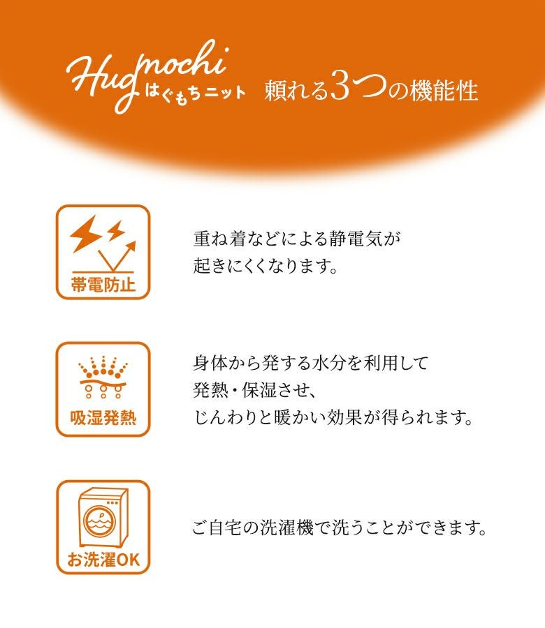 帯電防止機能により、重ね着による静電気を起こしにくくします。また、吸湿発熱機能で肌寒い季節でも快適に過ごすことができます。さらにマシンウォッシャブルでお家でのお手入れが可能◎