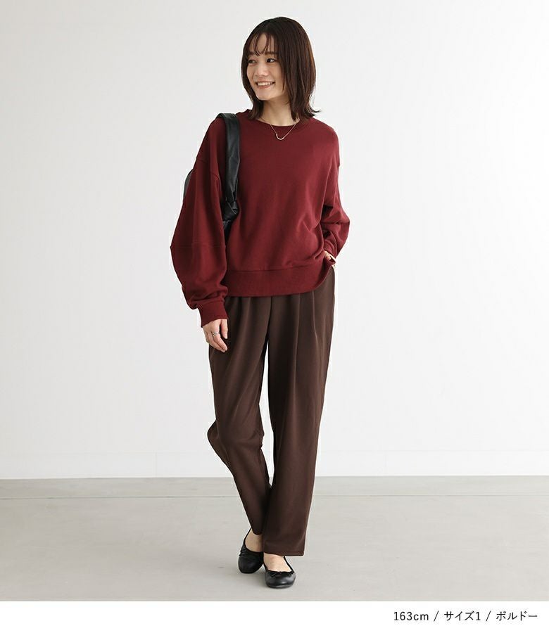 【普段着用】 Tops: L/LL Bottoms: L/LL | 【1】 袖丈:手の甲が隠れる位 着丈:ヒップ上3cm位 腕周り:ややゆったり バスト:ややゆったり 全体:スッキリ