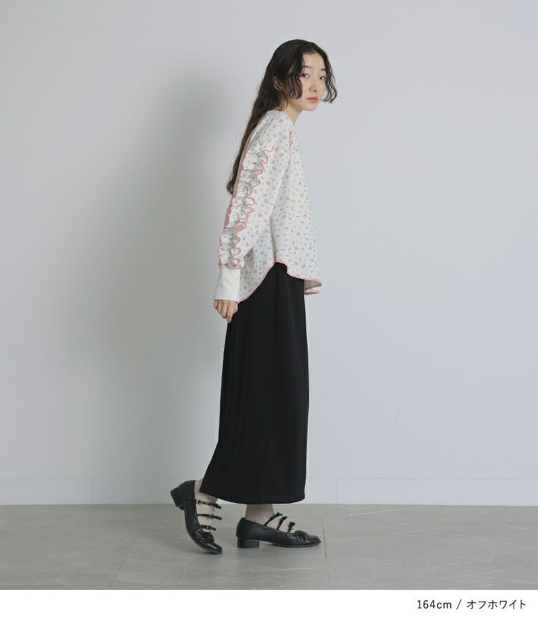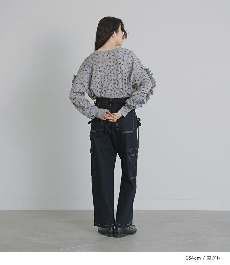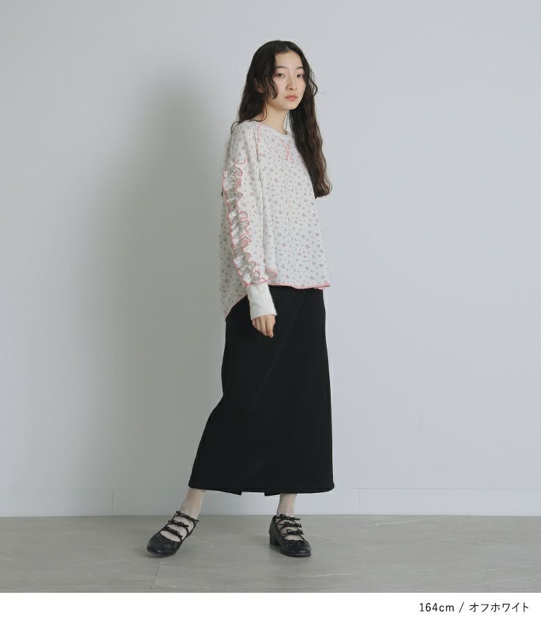 デニムなどのカジュアルなボトムスにも、女性らしいスカートスタイルにも合うトップスです。サロペットなどのインナーに着用してもフリルや花柄がアクセントになります。