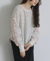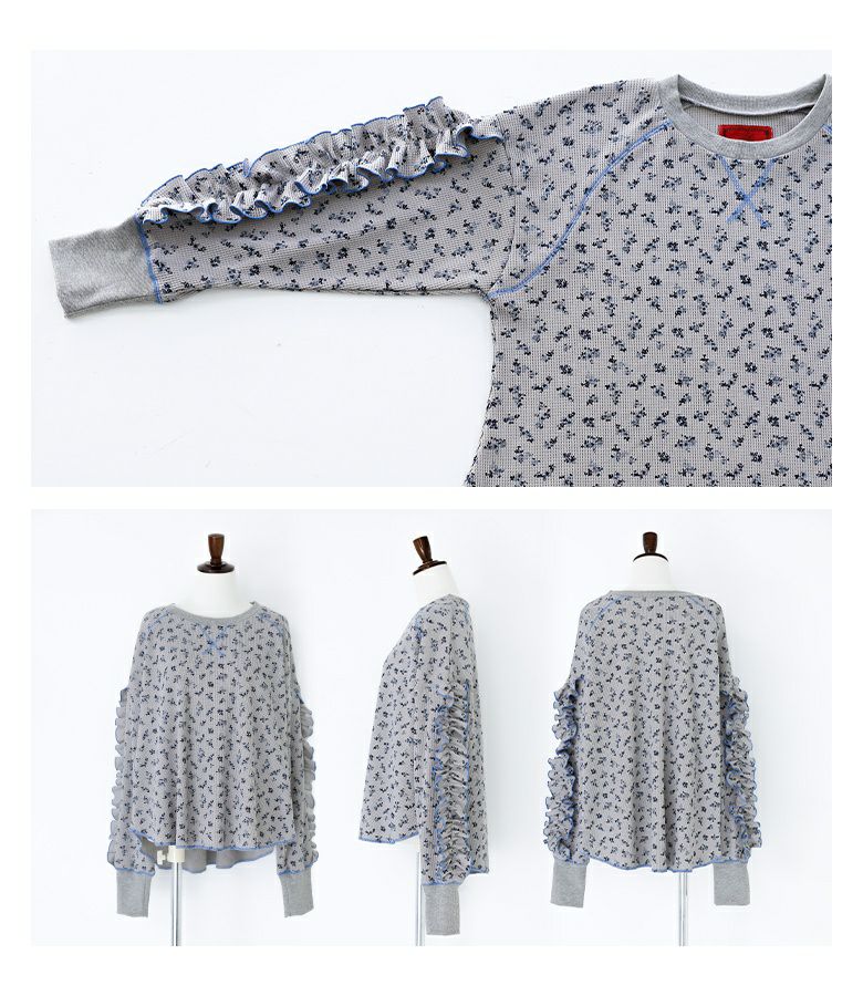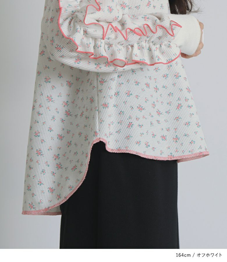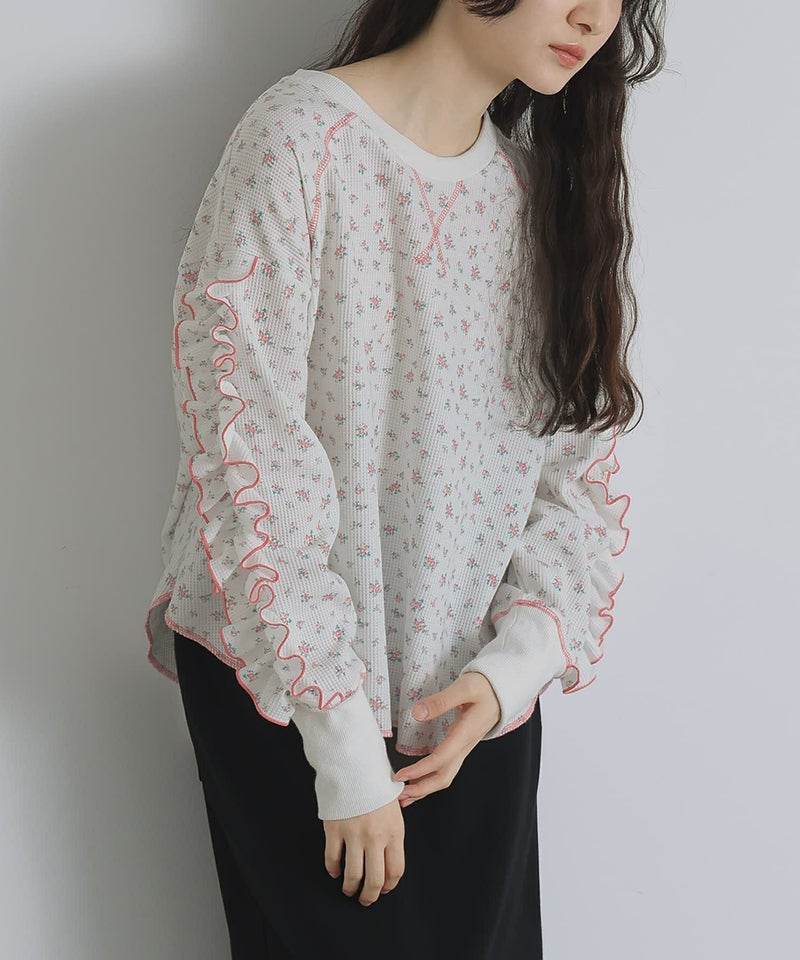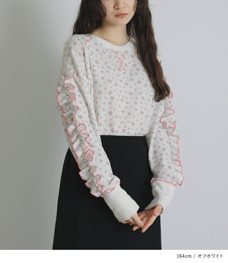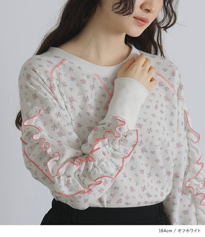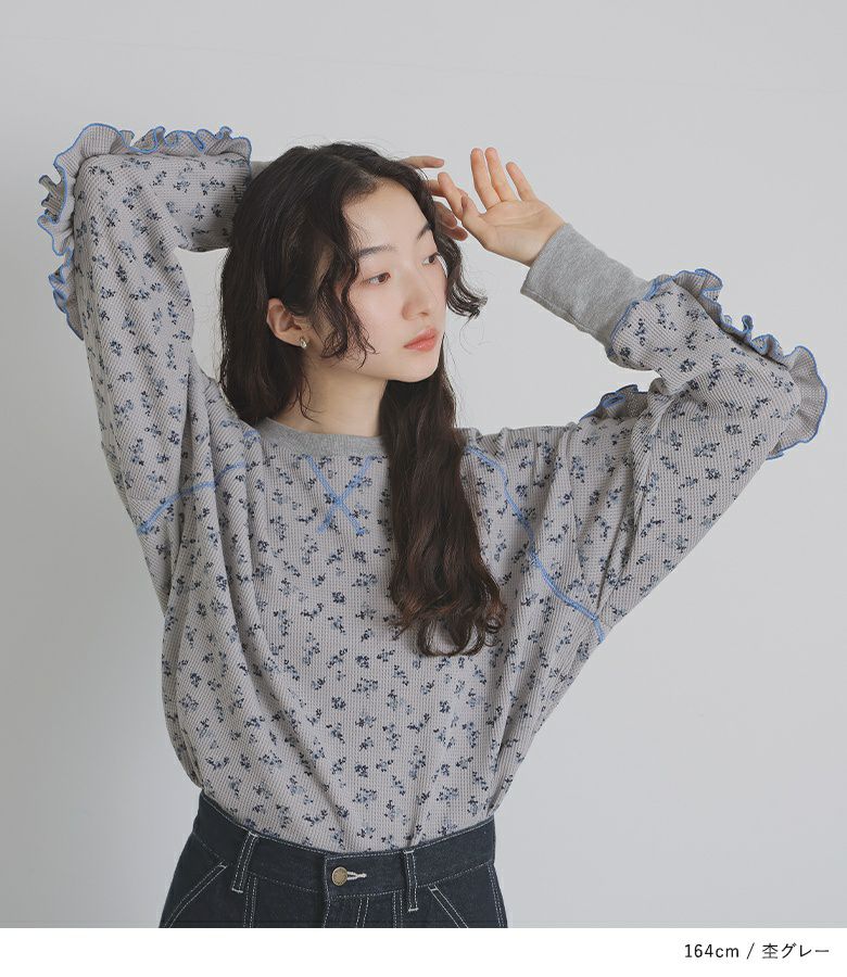 花柄のワッフル生地を使用した、カジュアルさと甘さの加減が好バランスなカットソー。袖にはメローフリルを入れて甘さをプラス、配色のVガゼットや振りステッチでカジュアルさも取り入れたデザインです。ラグランスリーブでゆるっと快適なシルエットにしました。