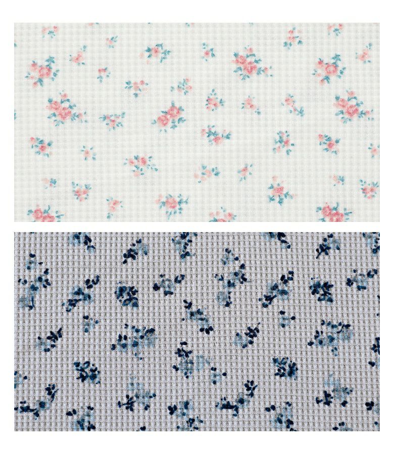 ぽこぽことした凹凸感のある柔らかなワッフル生地に、花柄をプリントしました。カラーごとに花柄のテイストも変えたこだわりの一枚です。