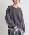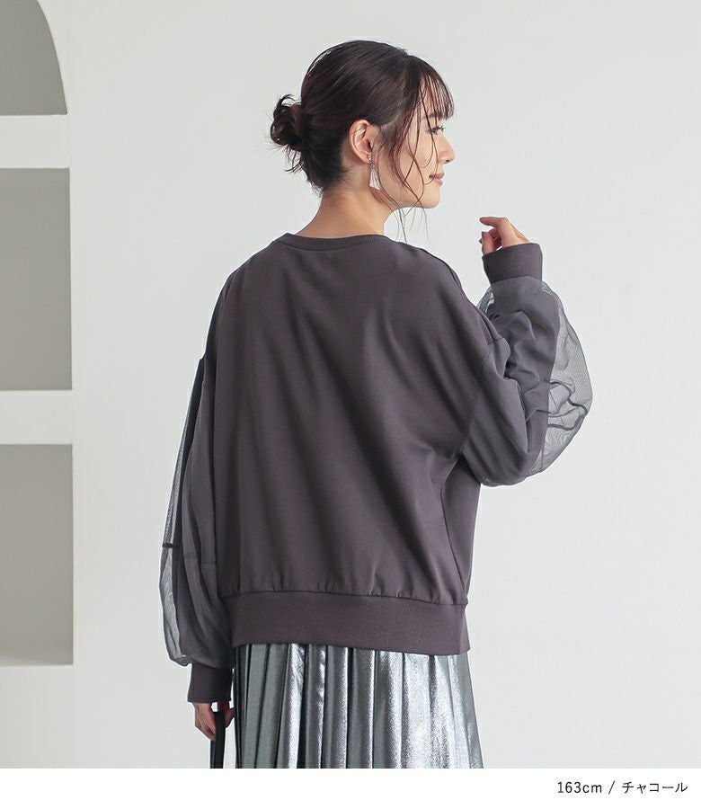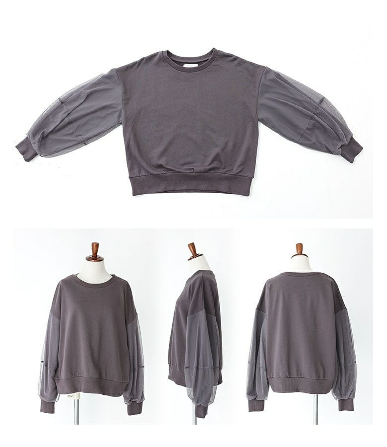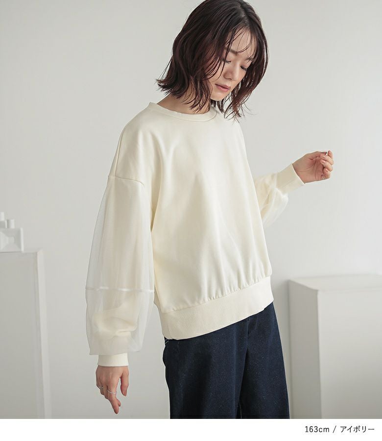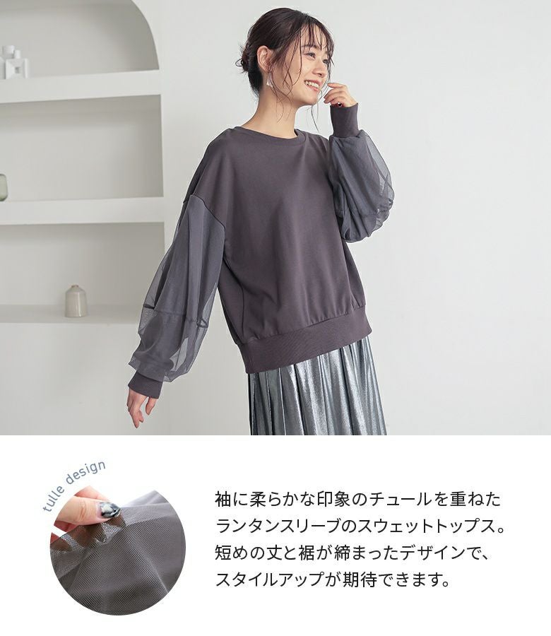 袖に柔らかな印象のチュールを重ねたランタンスリーブのスウェット。