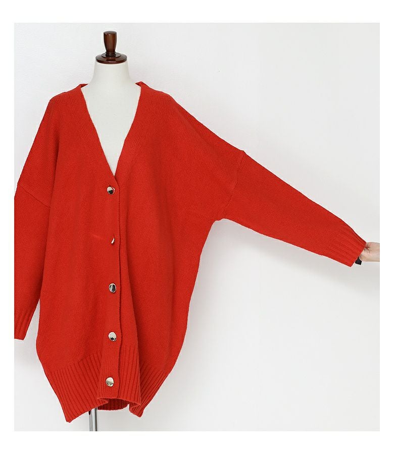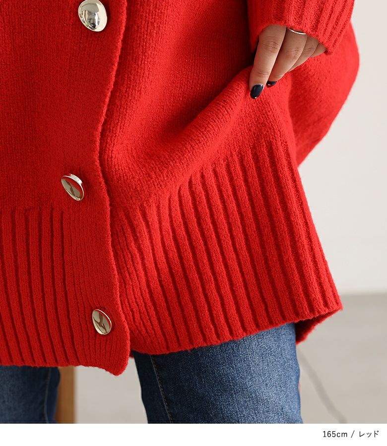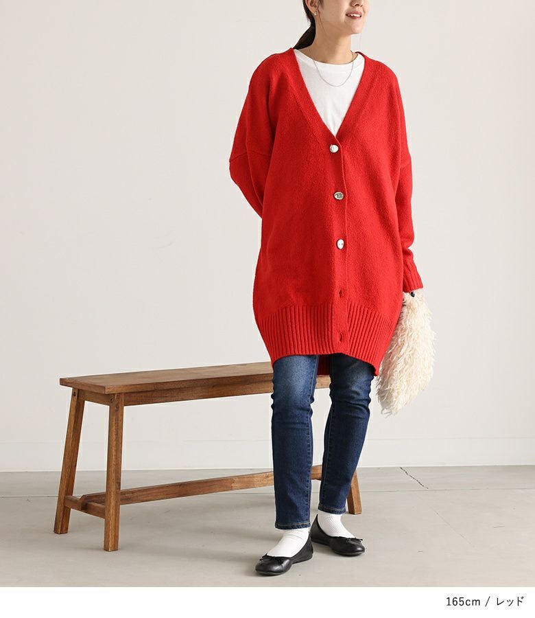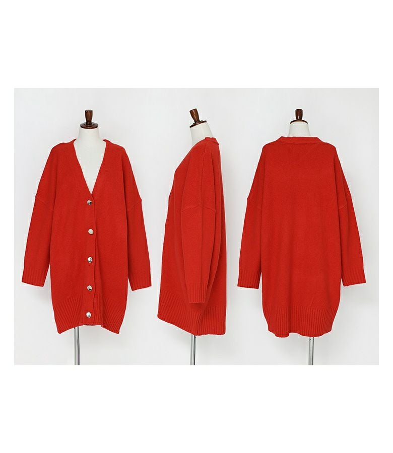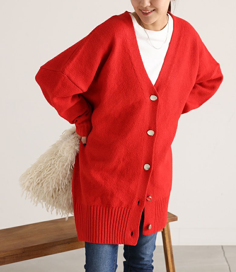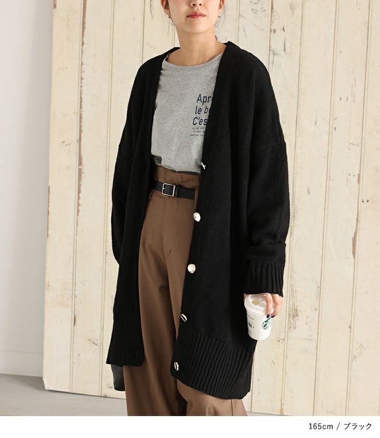 オーバーサイズで気になるヒップ回りもカバーしてくれるカーディガン。シンプルなデザインにシルバーのボタンがアクセントになった一枚です。