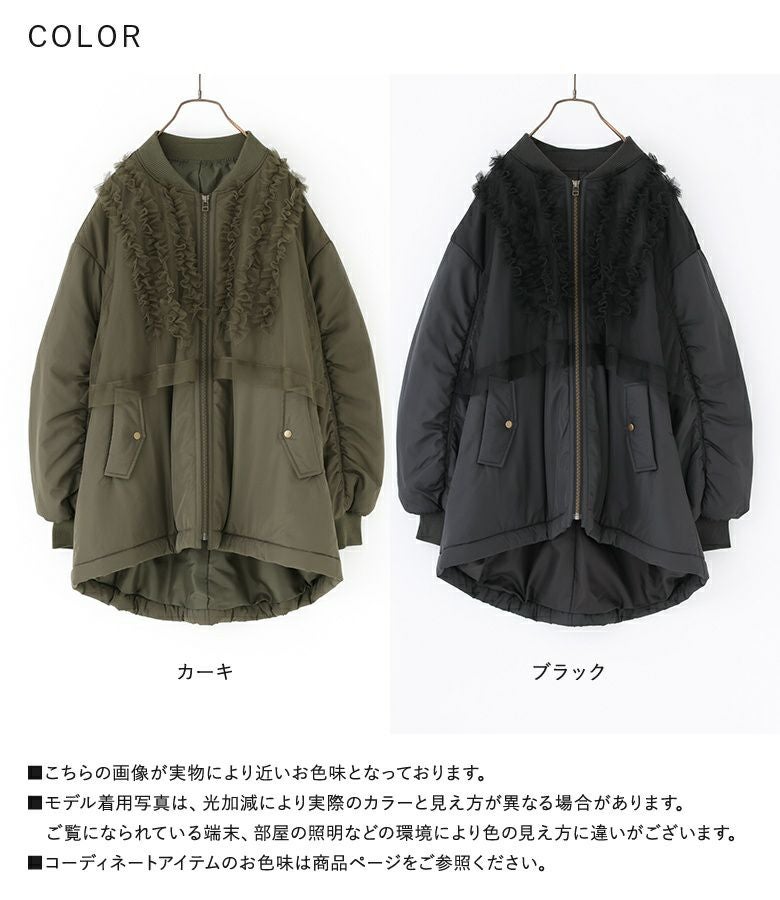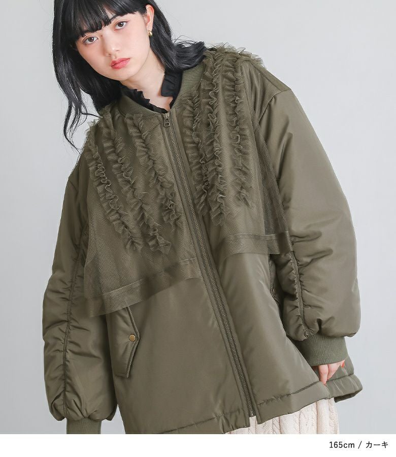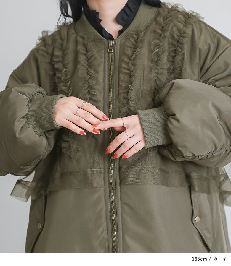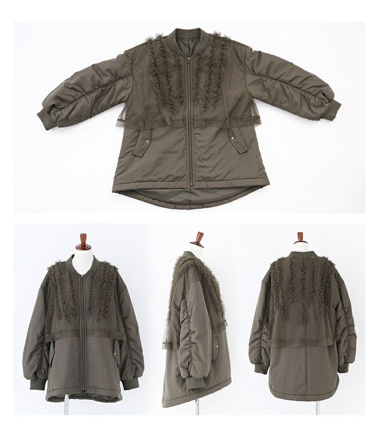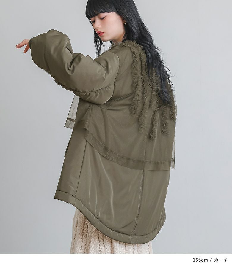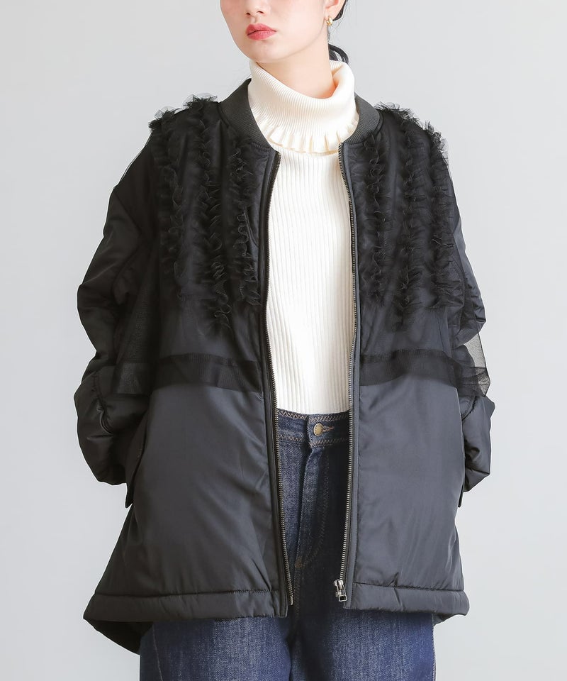 チュールをレイヤードしたMA-1風のミドルブルゾン。レイヤードしたチュールにはフリルをたたきつけて甘さもプラスし印象的なデザインです。前後差のある着丈とAラインのシルエットで抜け感のある大人印象に。中綿がしっかり入っているので軽くて暖かい優秀アウターです。