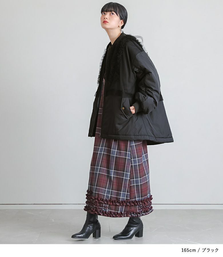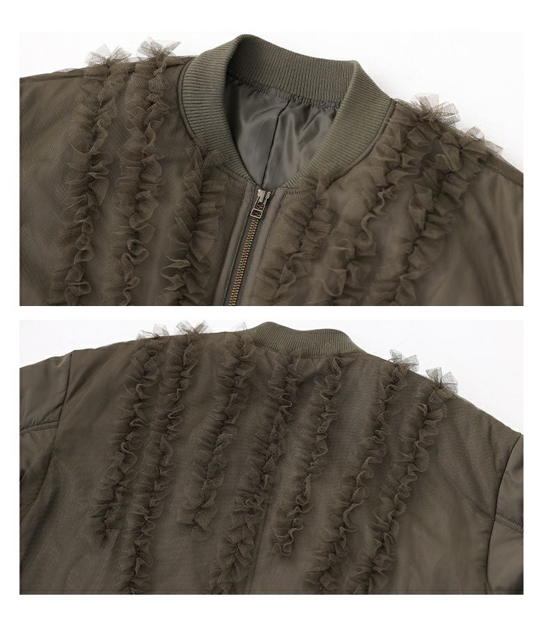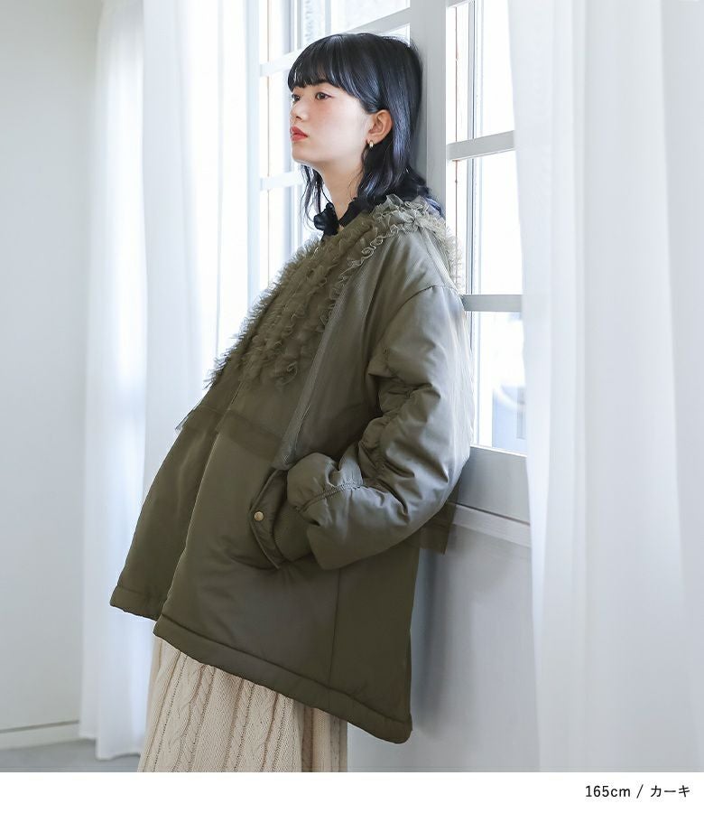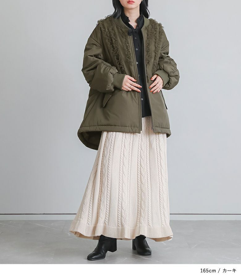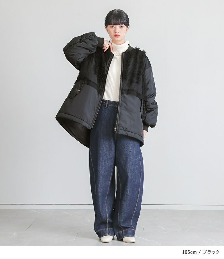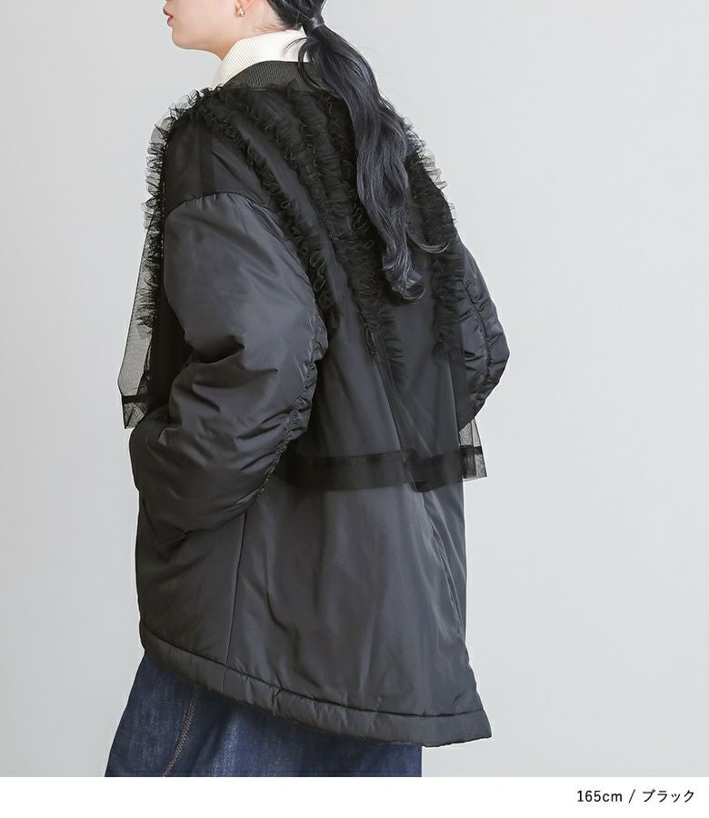 チュールをレイヤードしたMA-1風のミドルブルゾン。レイヤードしたチュールにはフリルをたたきつけて甘さもプラスし印象的なデザインです。前後差のある着丈とAラインのシルエットで抜け感のある大人印象に。中綿がしっかり入っているので軽くて暖かい優秀アウターです。