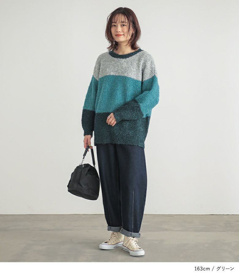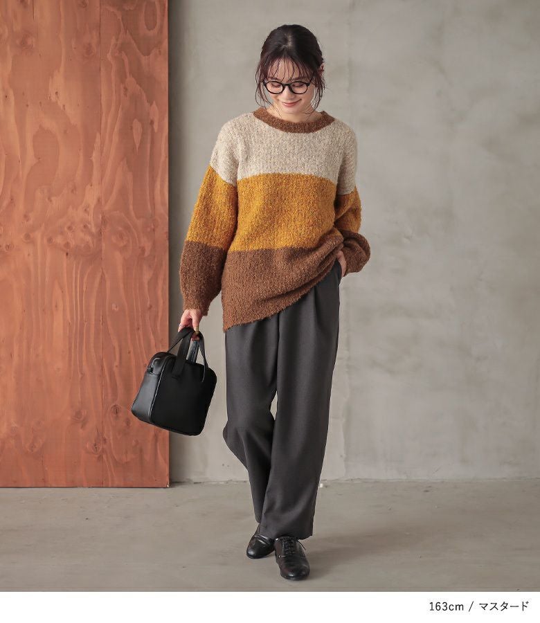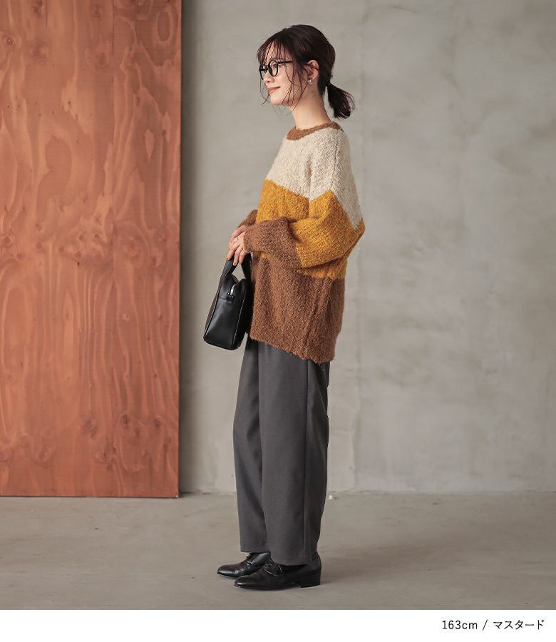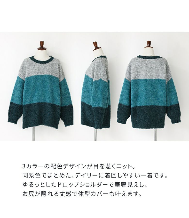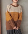 同系色でまとめた、3カラーの配色デザインが目を惹くニット。